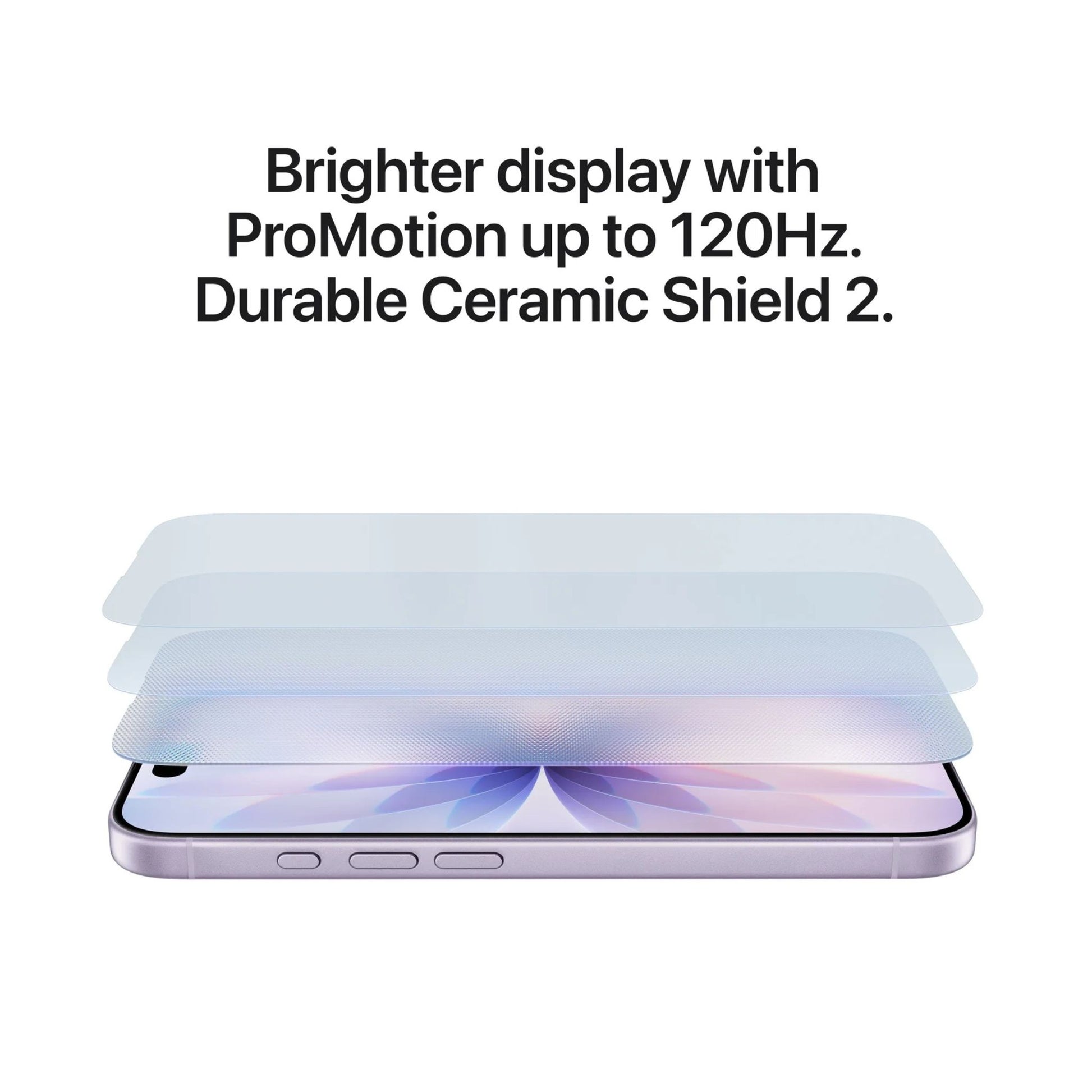 Super Retina XDR Display with ProMotion and Dynamic Island: Enjoy a larger, immersive Super Retina XDR display featuring ProMotion technology with up to 120Hz refresh rate for ultra-smooth scrolling and responsiveness, an Always-On display for quick access to essential information, and Dynamic Island for seamless, interactive alerts and live activities.