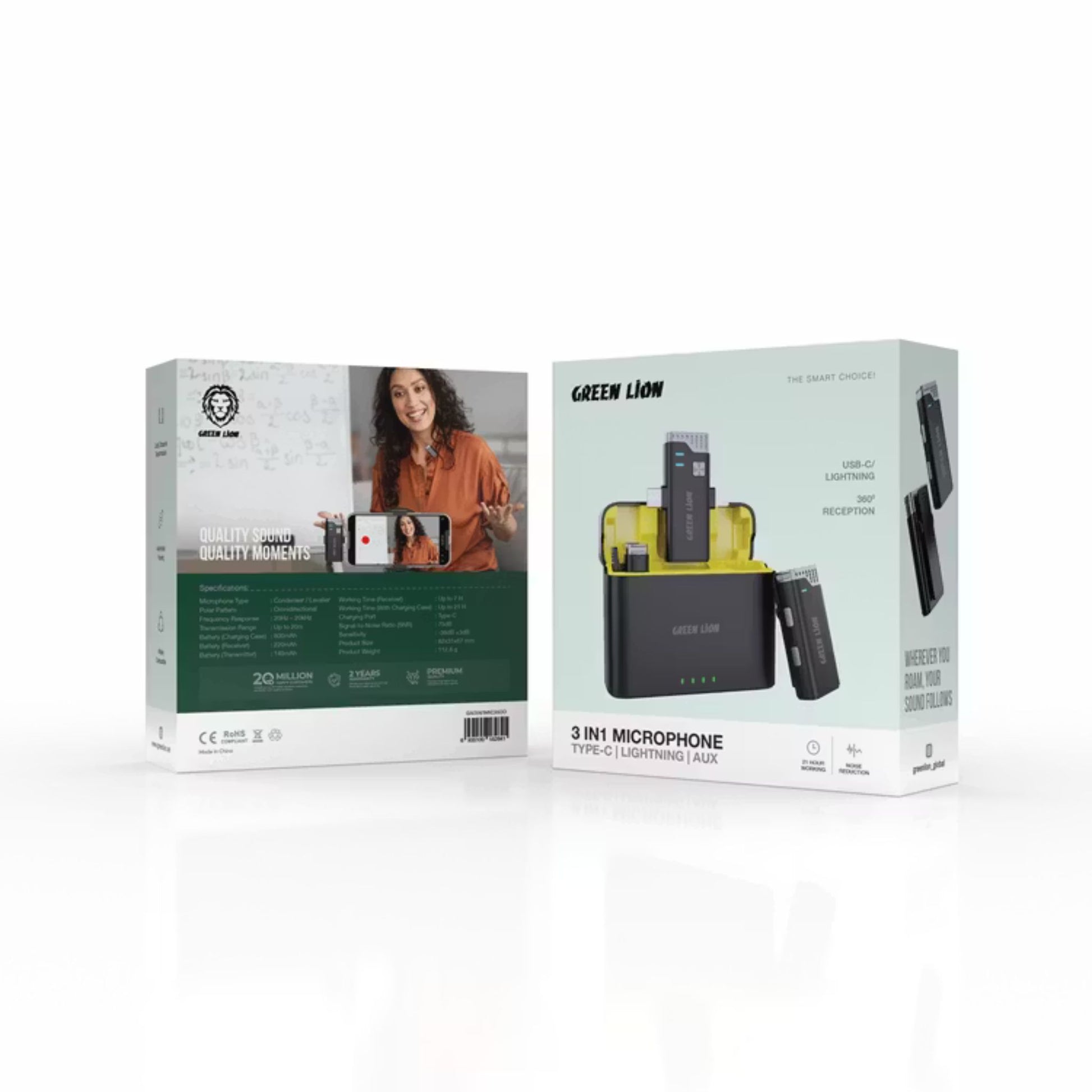 The Green Lion 3-in-1 360° Microphone provides great audio performance and has a working time of up to 21 hours, making it ideal for long-term use. Its USB-C and Lightning connectors allow it to work with a wide range of devices. This microphone records sound from all directions, guaranteeing clear and well-balanced audio, thanks to its 360° reception range. The automatic pairing feature makes connections quick and easy. In addition, the noise-canceling feature improves your listening by blocking out background noise. The microphone delivers high-quality sound. It operates at a 2.4GHz frequency. The frequency response is 20Hz to 20kHz. It also features a sampling frequency of 48kHz. It offers mobility and flexibility with a transmission range of up to 20 meters. The transmitter has a 140mAh battery, while the receiver has a 220mAh battery. The receiver can operate for up to seven hours on its own. Whether you need a microphone for presentations, podcasts, or video recordings, the Green Lion 3-in-1 360° Microphone is the perfect option.