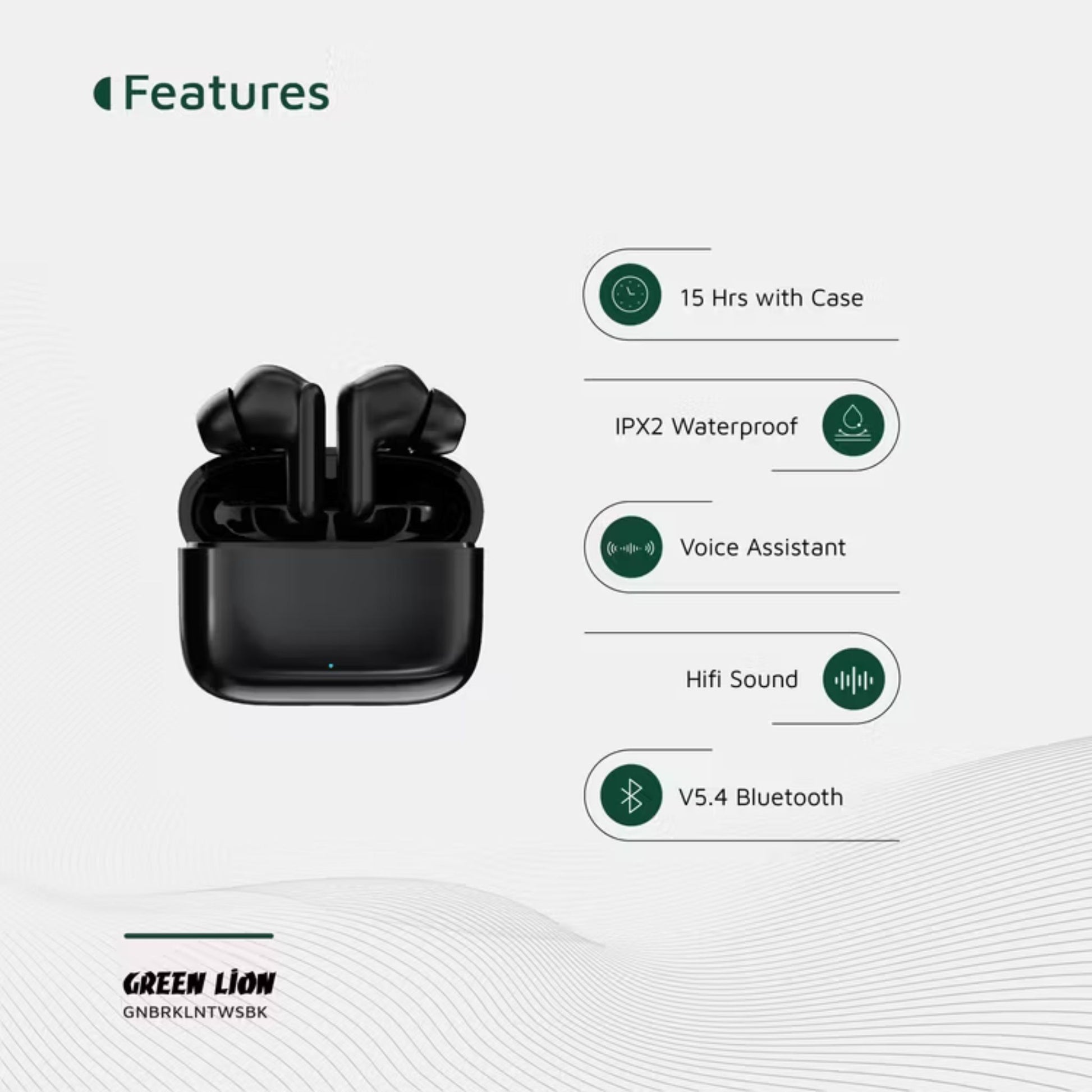 The Green Lion Brooklyn True Wireless Earbuds are designed for those who value comfort and sound quality. These earbuds use advanced Bluetooth 5.4. This ensures a smooth, steady connection with your devices. You can enjoy calls, music, and more without interruptions. Just tap to play, pause, or adjust the volume. The touch control makes it easy at home or on the go. Brooklyn earbuds offer great sound quality. They have a built-in microphone for clear calls and HiFi sound for enhanced listening. Their IPX2 waterproof rating means they can handle minor splashes. This makes them great for rainy days or workouts. You can play for up to 4 hours on one charge and up to 11 hours with the case. Type-C charging is easy and quick, so you're always prepared to go. The Green Lion Brooklyn true wireless Earbuds blend style, performance, and convenience into a sleek design. They fit comfortably and securely.