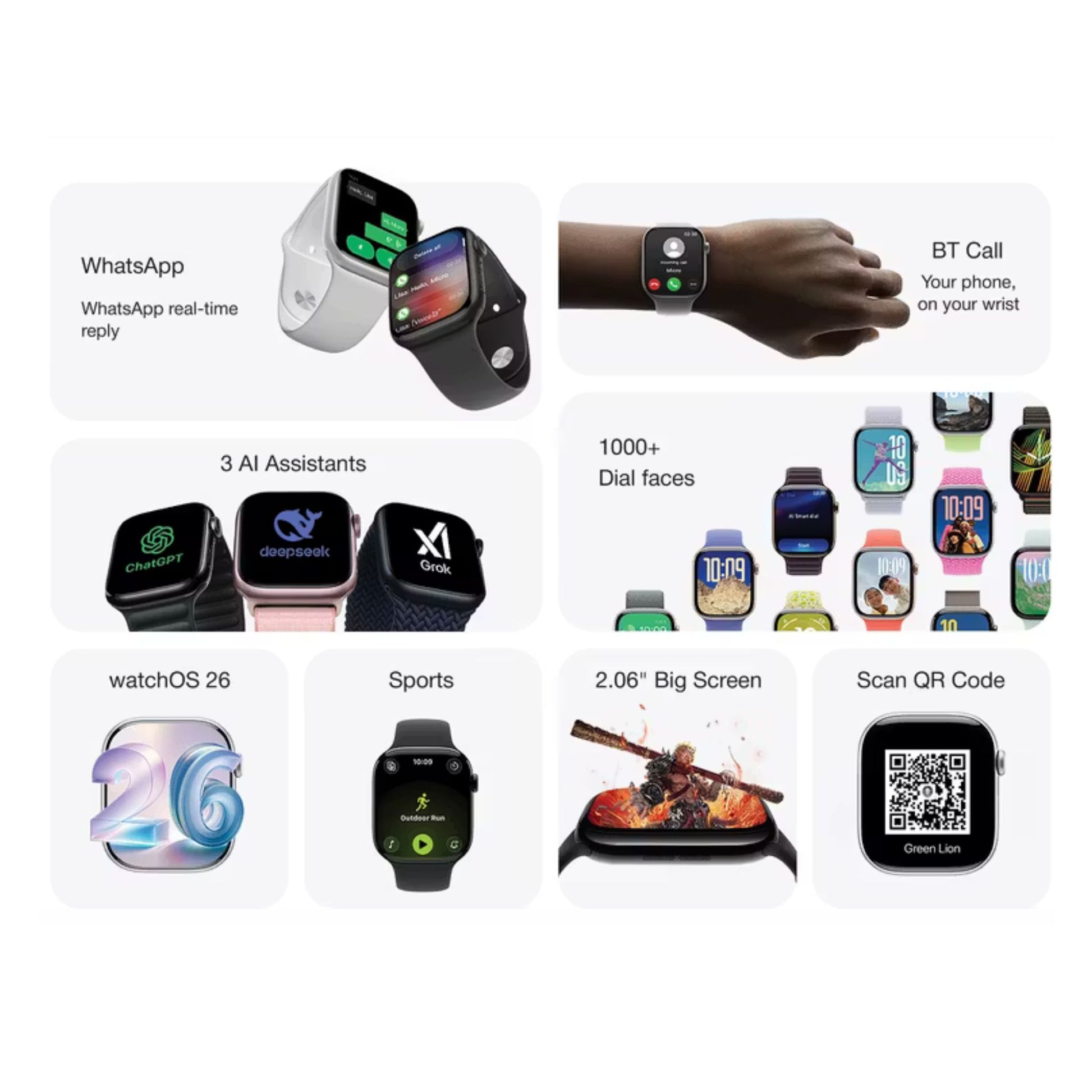 The Green Lion Flex 46 2.06'' IPS Smart Watch is designed to keep you connected wherever you are. The perfect combination of fashion and functionality. You can see your notifications clearly and brightly thanks to its 2.06-inch IPS display, which is always on to make sure you never miss anything. Establish a simple connection with three AI assistants. Enjoy real-time WhatsApp replies and Bluetooth calls. The double-tap feature makes navigation simple and quick, adding even more convenience. Whether you’re exercising or exploring, it has you covered. Its 250mAh battery lasts up to three days with active use and ten days on standby. The Green Lion Flex 46 offers sports modes, a compass, a barometer, and translation features. It’s built to last. It is also prepared for anything thanks to its IP54 waterproof rating.