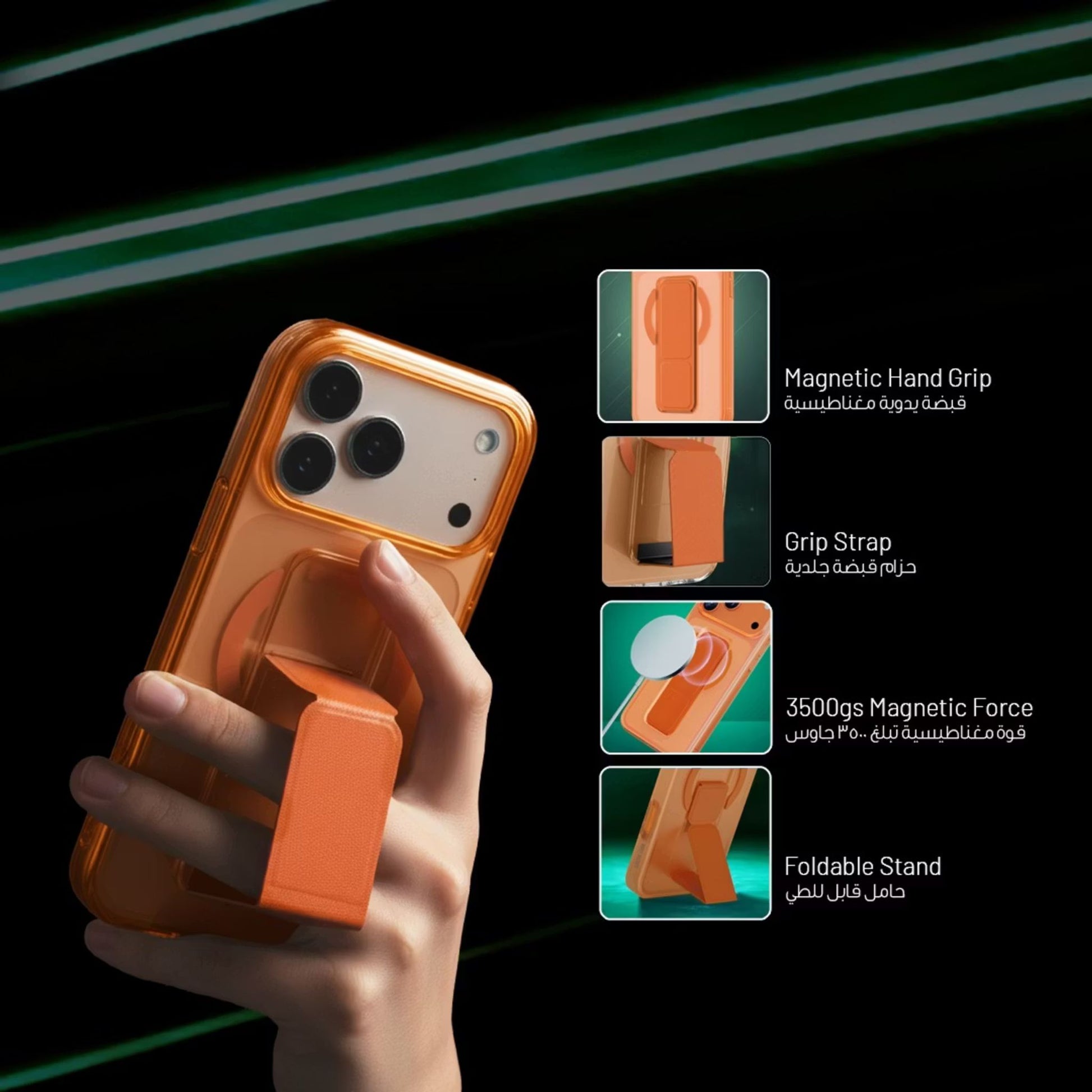 Green Lion Grip 360° MagSafe Case for iPhone 17 Pro, Up to 3500gs Force Impact Resistance, Foldable Stand, Strong Magnets, Drop Protection, Anti-Scratch, Leather Grip Strap, Camera Protection, Horizontal & Vertical Features - Orange Titanium