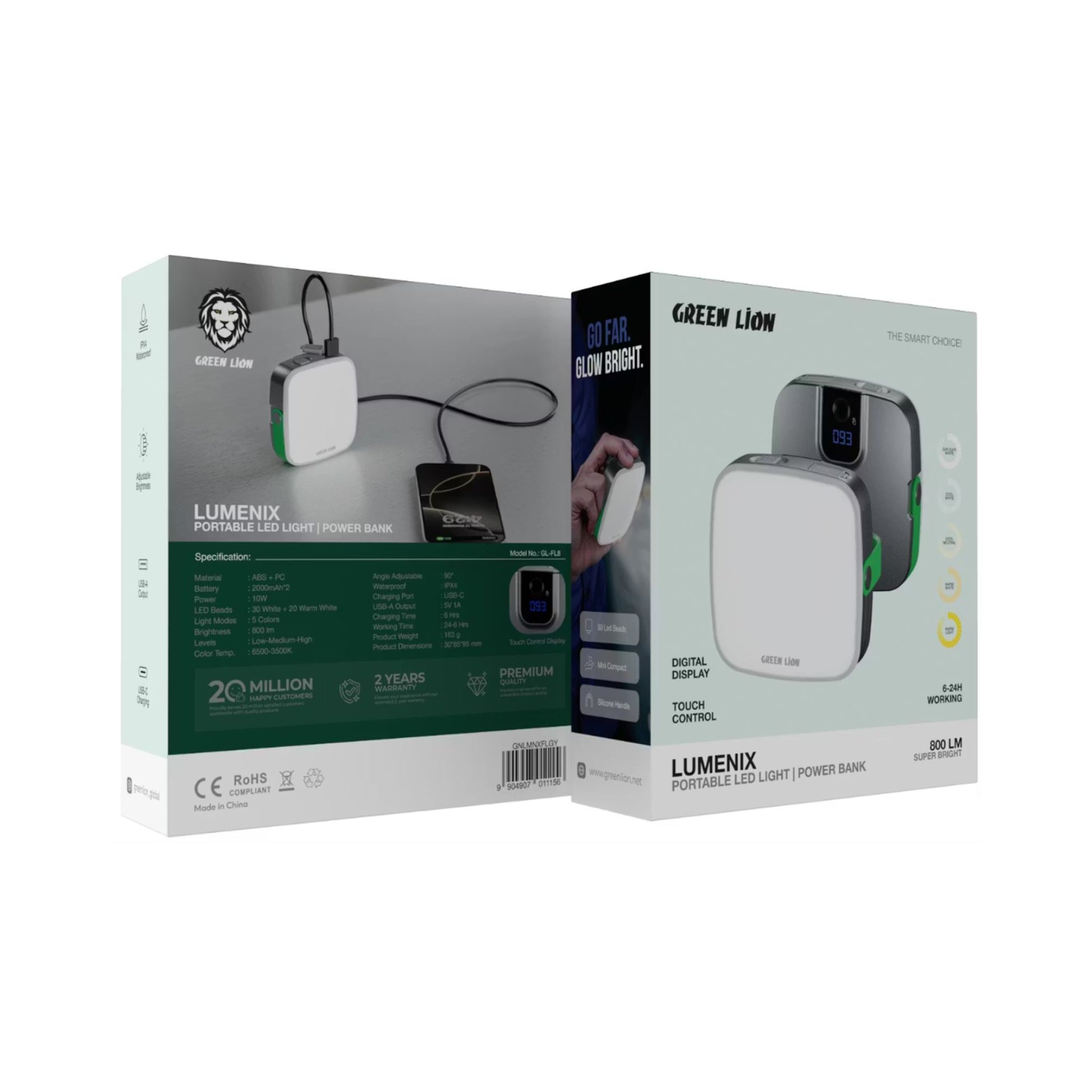 Green Lion Lumenix Portable LED Light with Built-in Power Bank, Up to 24 Hours Working Time, 5 Light Modes, Digital Display & Touch Control, Adjustable Brightness, 10W Power - Gray