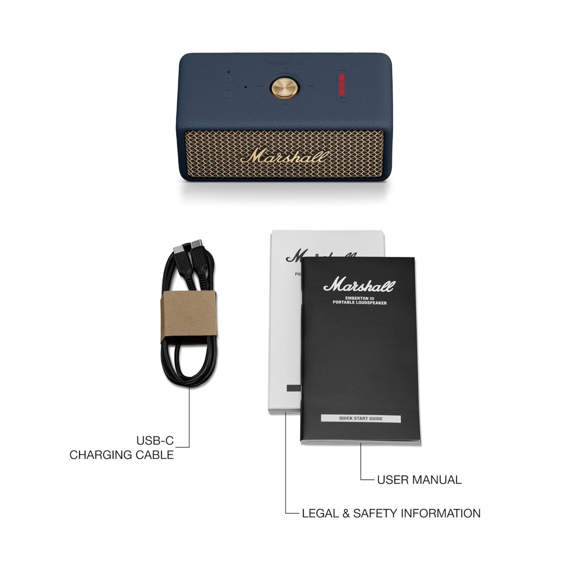 The Marshall Emberton III Portable Wireless Speaker in midnight blue offers strong sound wherever you go. It also has over 32 hours of playtime on one charge. You can easily keep the music playing wherever you are, thanks to its short 2-hour charge period. This speaker has an IP67 waterproof rating and a weatherproof design. It’s perfect for indoor and outdoor use. No matter if you're hiking, relaxing by the pool, or at the beach, the Emberton III keeps the music playing. The built-in microphone makes hands-free calls easy. It offers convenience and great audio quality. Bluetooth 5.3 provides a stable and fast wireless connection for hours of continuous listening. The Marshall Emberton III Portable Wireless Speaker is perfect for those who value performance and style. It’s compact, sturdy, and ready for any occasion.