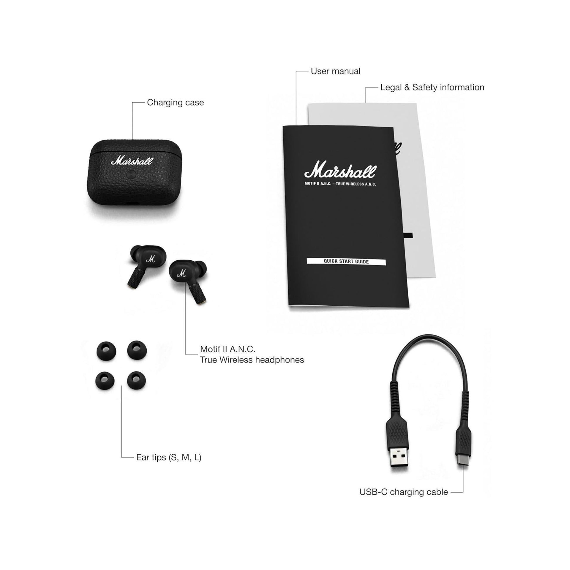 Marshall Motif II Wireless Earbuds with ANC, Touch Controls, Up to 30 Hours Playtime, Fast Charge, Water Resistant, Wireless Charging Compatible, Marshall Signature Sound - Black