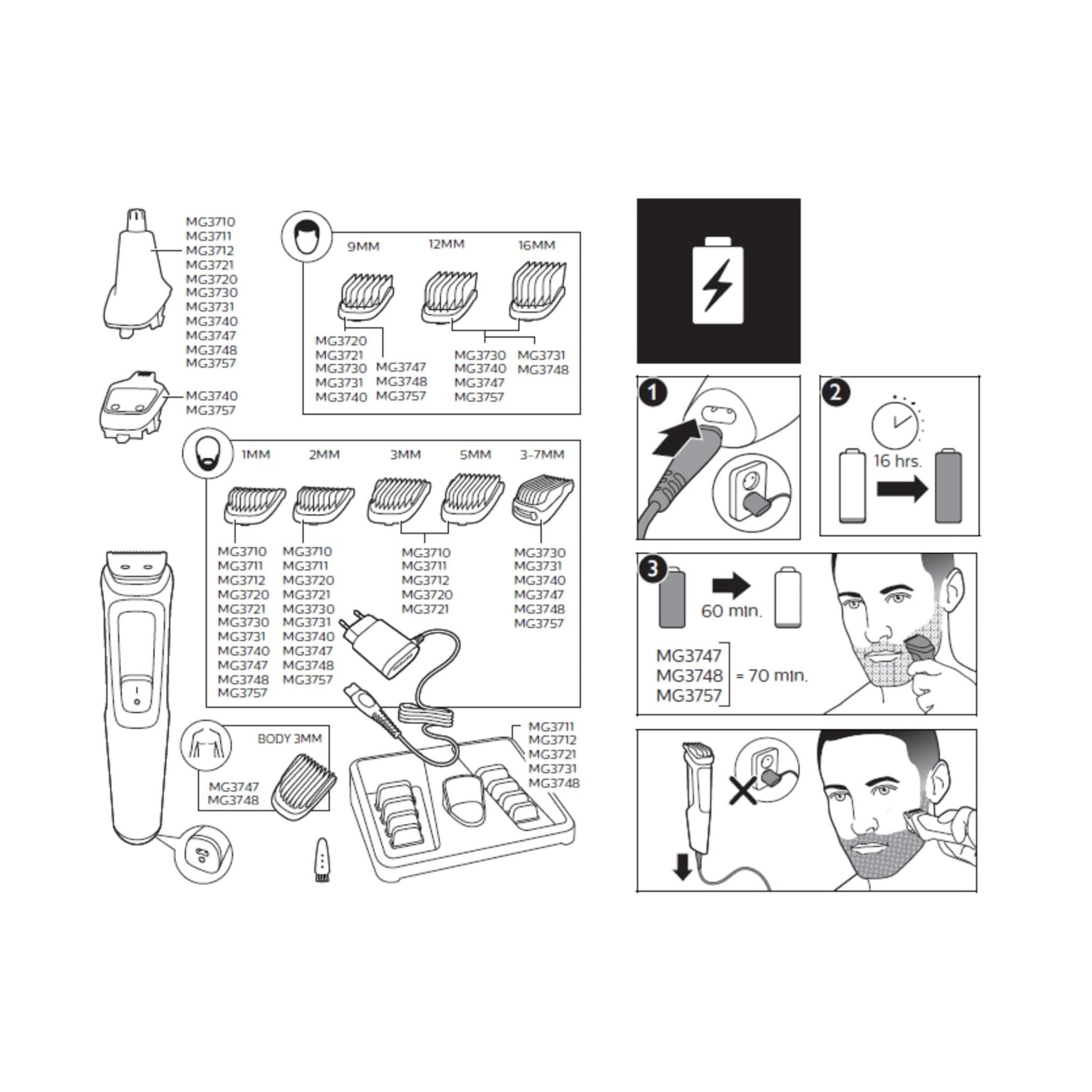 PHILIPS Multigroom Series 3000 for Face, 6-in-1 Grooming Kit for beard, moustache, nose & ear hair, cordless, 60 min runtime, 16h full charging time,Black