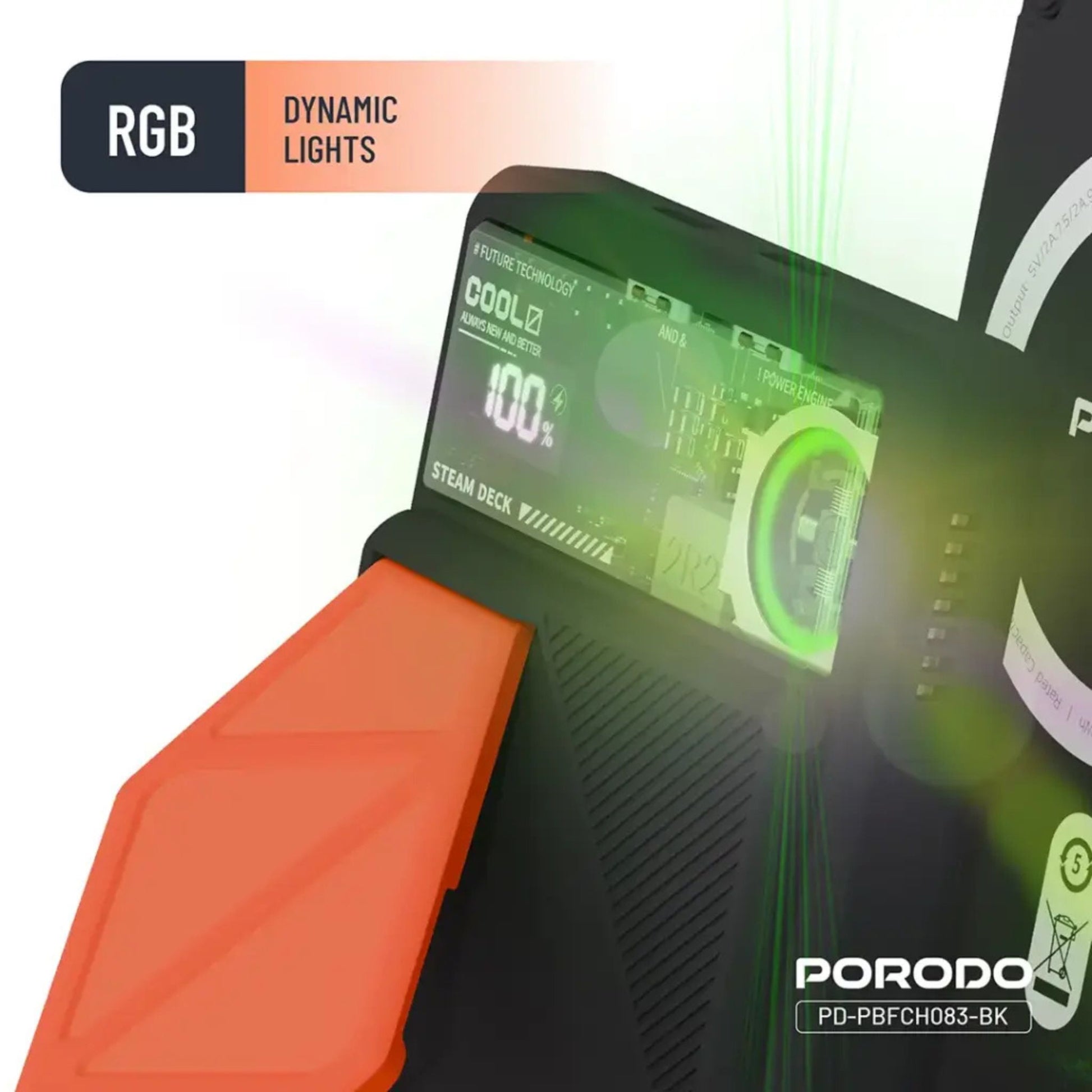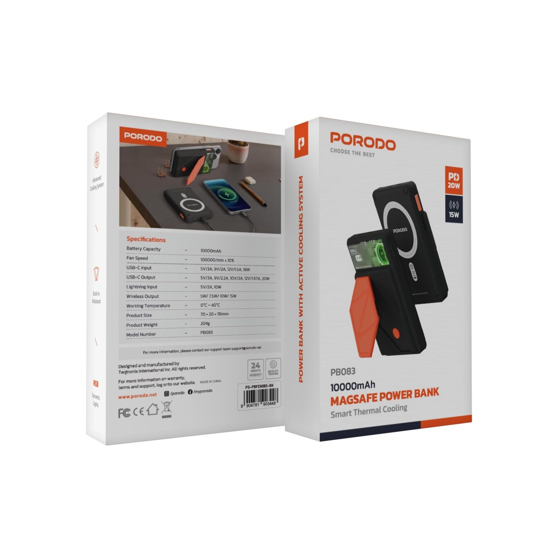 Porodo 10000mAh Power Bank, Compatible with MagSafe, Smart Thermal Cooling, Built-in Fan, Grip Stand, 20W PD, 15W Wireless Charging, Lightning & USB-C Ports, Compatible with iPhone 16/15/14/13, S25-Black