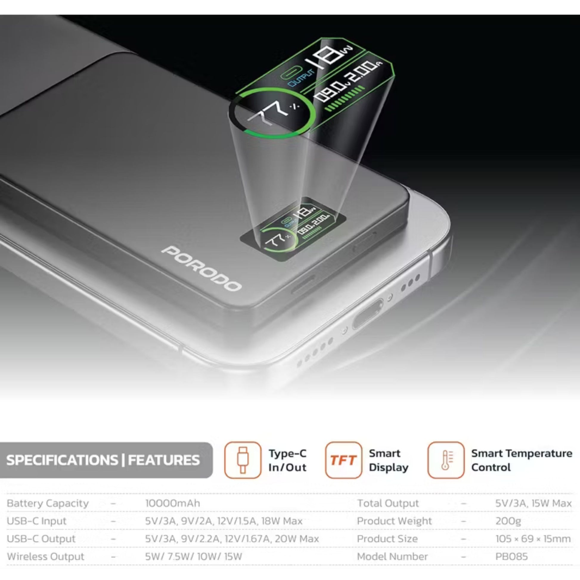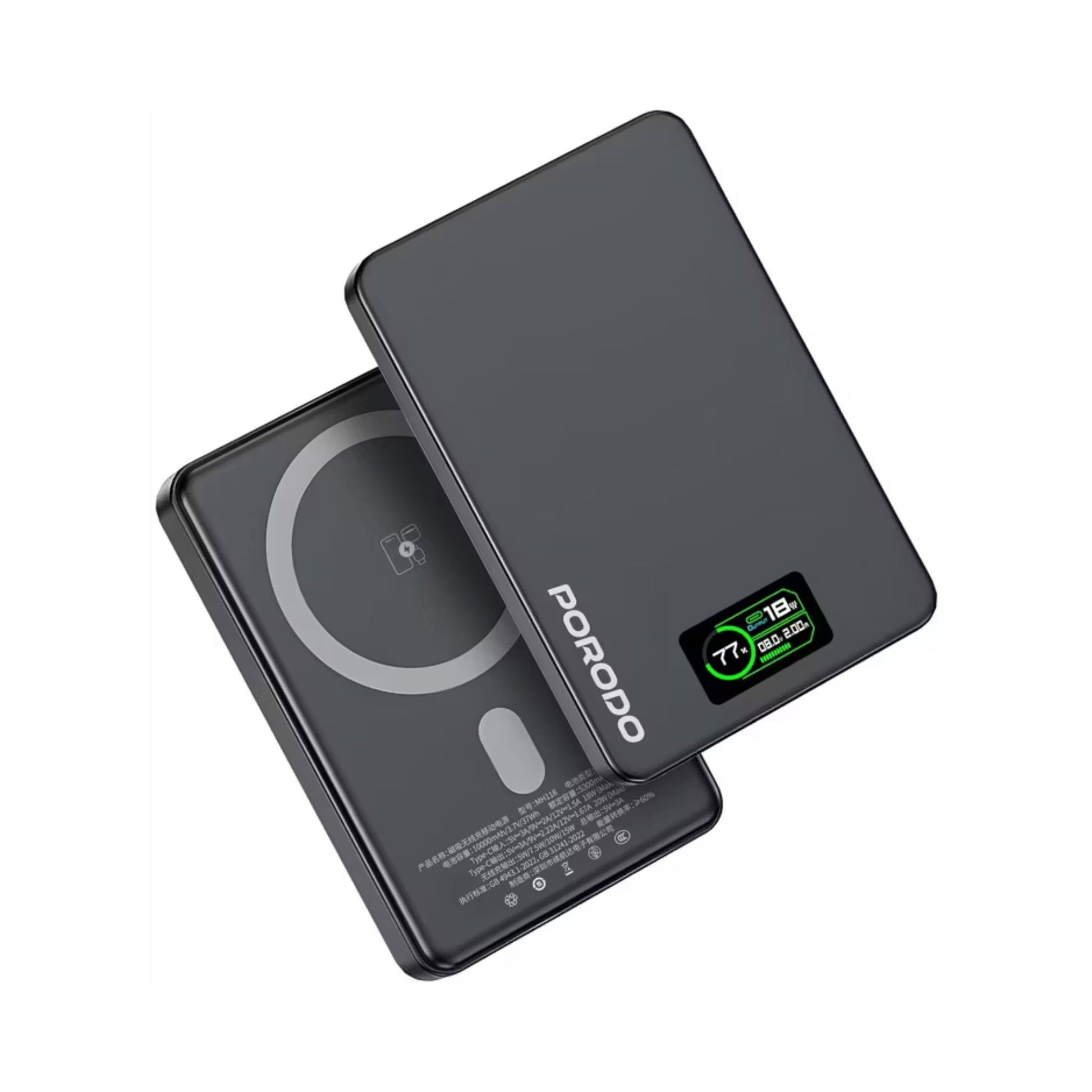 The Porodo 10000mAh Power Bank is an essential accessory for modern tech users. Equipped with a real-time TFT smart display, it provides precise battery status updates. This power bank has a Type-C input and output port. The power bank supports 20W Power Delivery (PD) fast charging. Additionally, it offers 15W wireless charging. Compatible with MagSafe devices, allowing for convenient cable-free charging. This power bank features smart temperature control, protecting your devices from overheating. Its compact and portable design makes it ideal for travel or daily use. The Porodo 10000mAh Power Bank ensures your devices stay powered and ready for use.