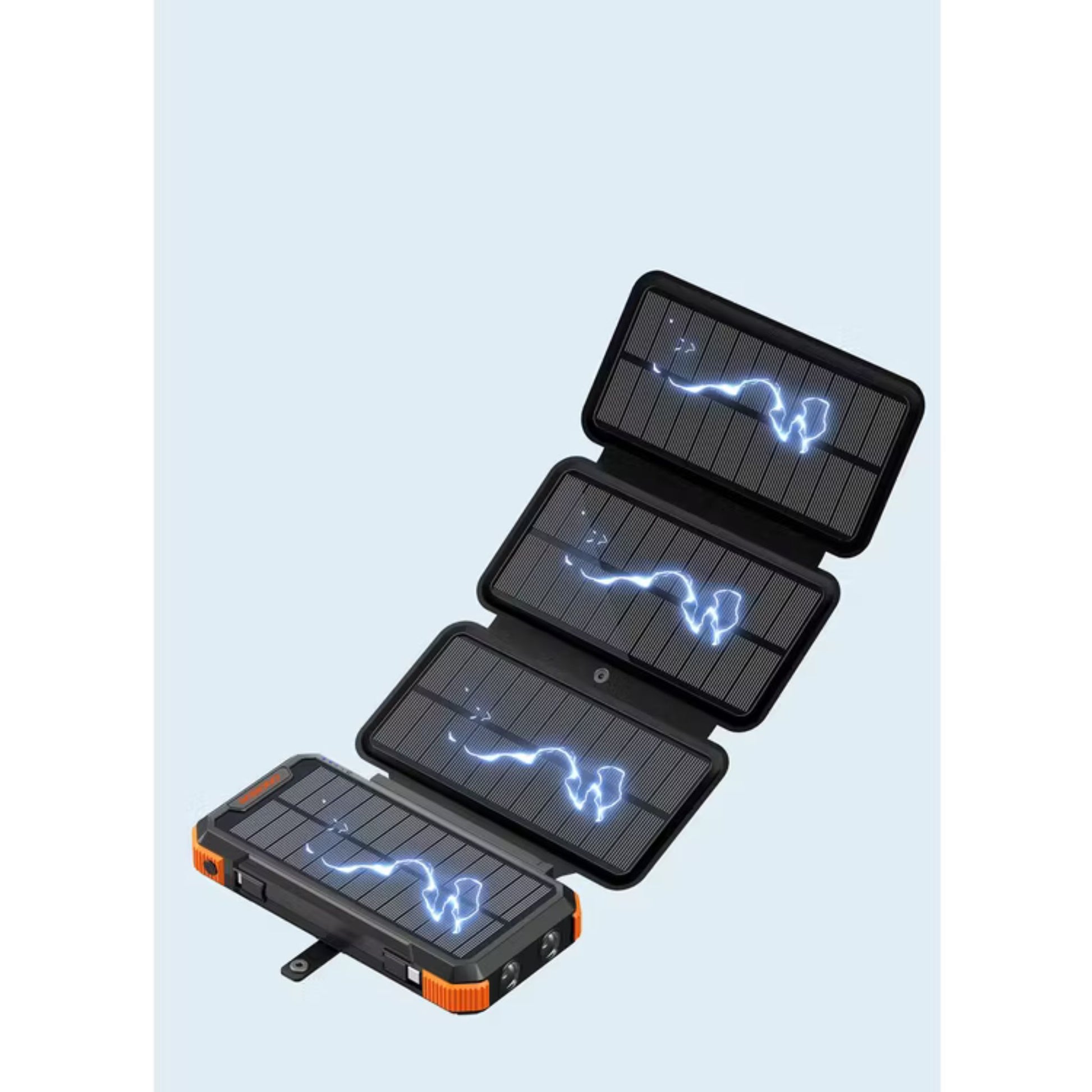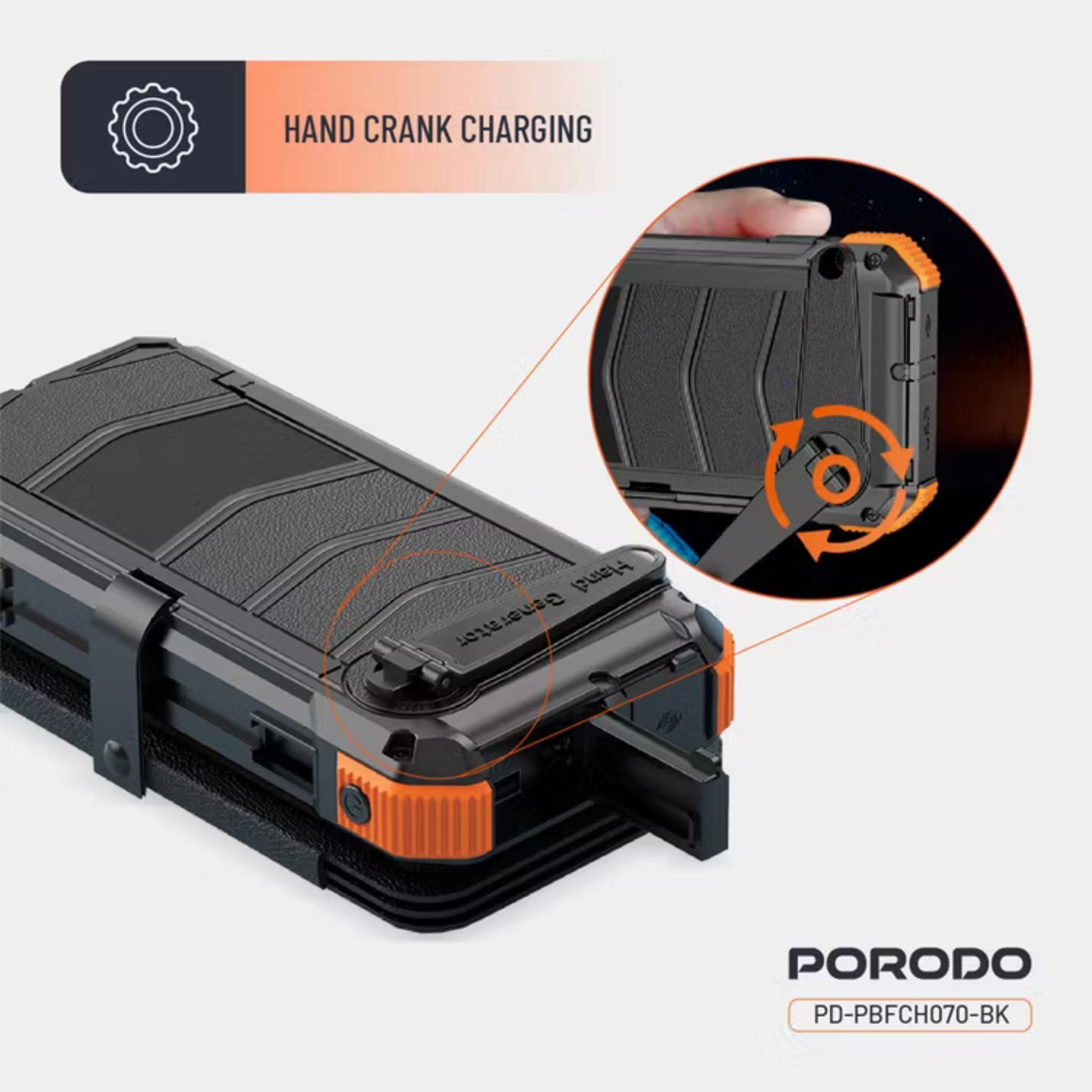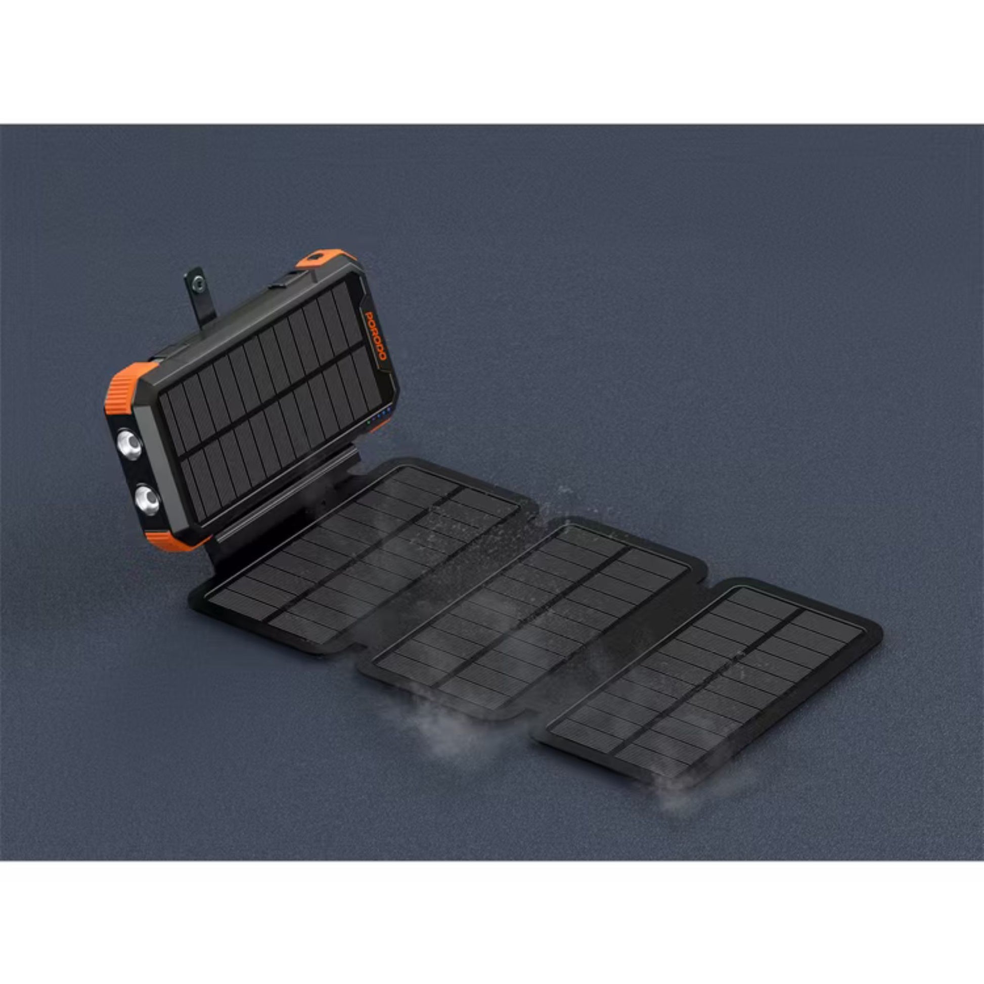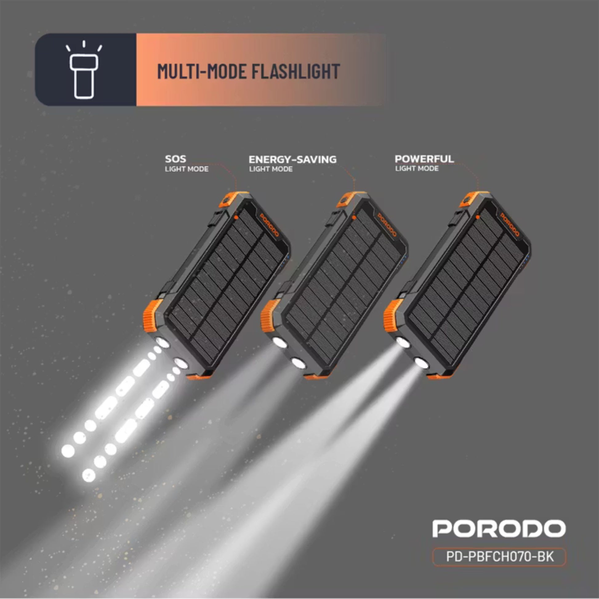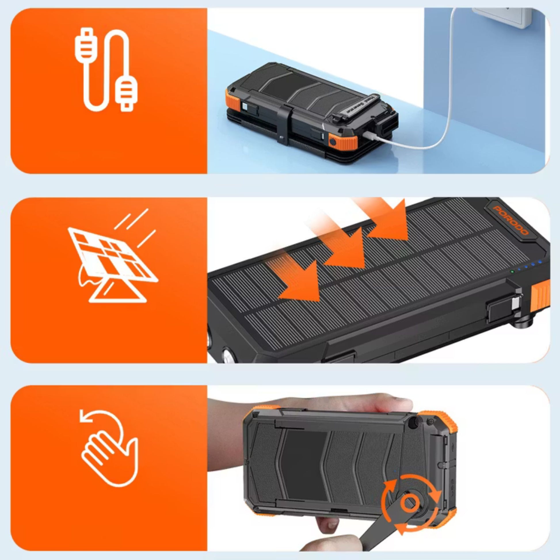 The Porodo 20000mAh 4-Panel Solar Power Bank offers an adaptable and reliable charging option for your devices, whether you're at home or on the move. With a powerful 20000mAh battery capacity, this power bank provides several output options, including Type-C (20W), USB-A (18W), and Micro USB (10W) for efficient charging. It's great for outdoor activities. The four solar panels capture solar energy. The IP45 water-resistant rating makes it durable in many weather conditions. If solar energy isn't available, you can also charge it with a hand crank. The multi-mode flashlight works well in many lighting conditions. Its detachable panels and cords make it easy to carry and use. This power bank can handle challenging conditions. It works in temperatures from -10°C to 40°C. The Porodo Solar Power Bank easily charges your devices while hiking, camping, or traveling.