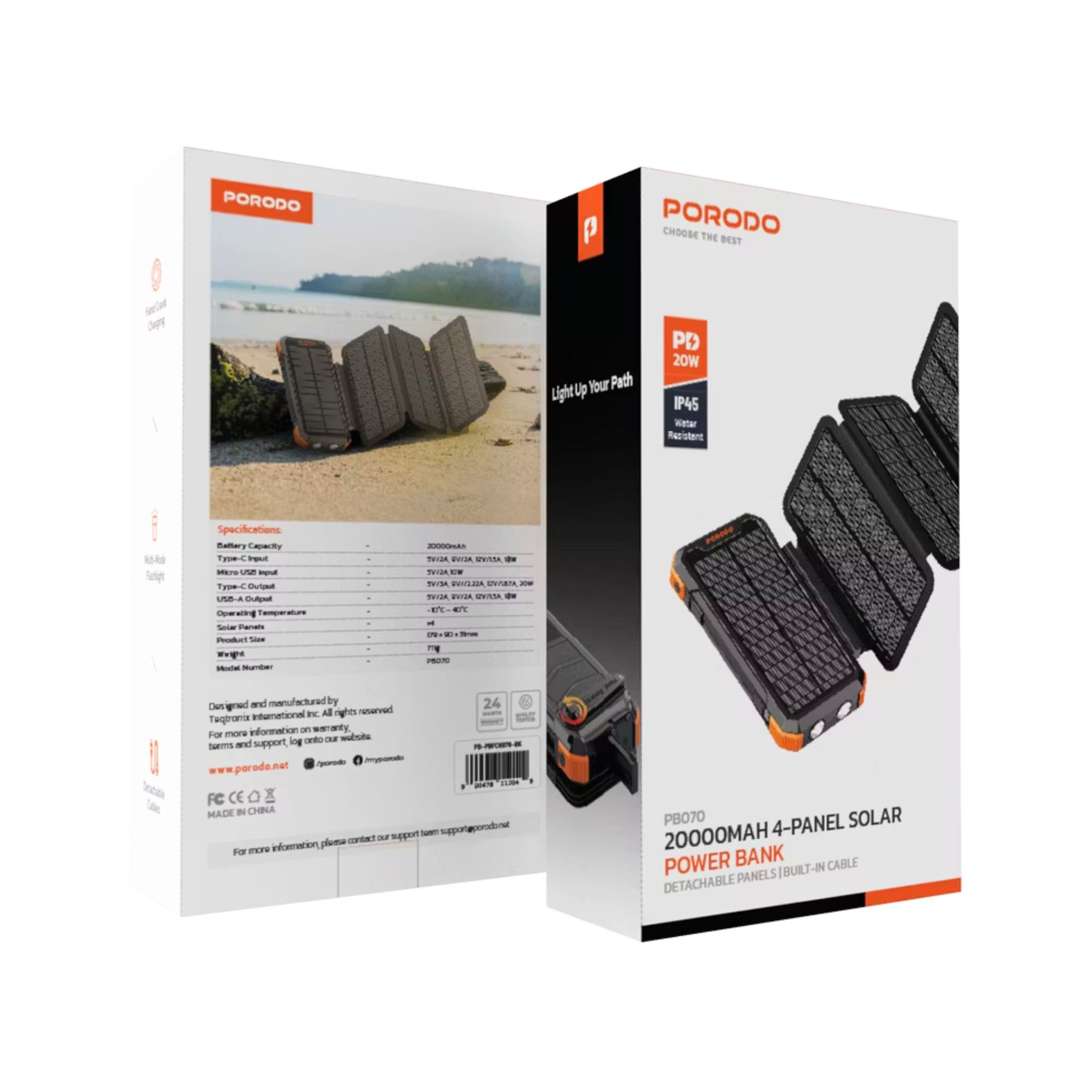 Porodo 20000mAh 4-Panel Solar Power Bank with 20W Power Delivery, Multi-Mode Flashlight, 10W Micro USB Input, Detachable Panels & Cables, - Black