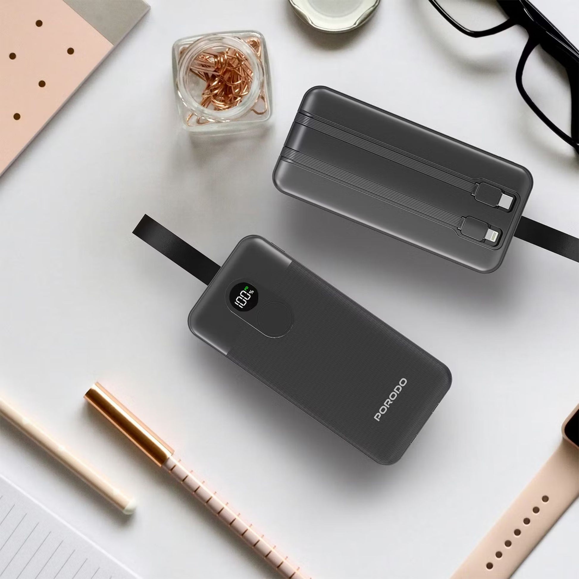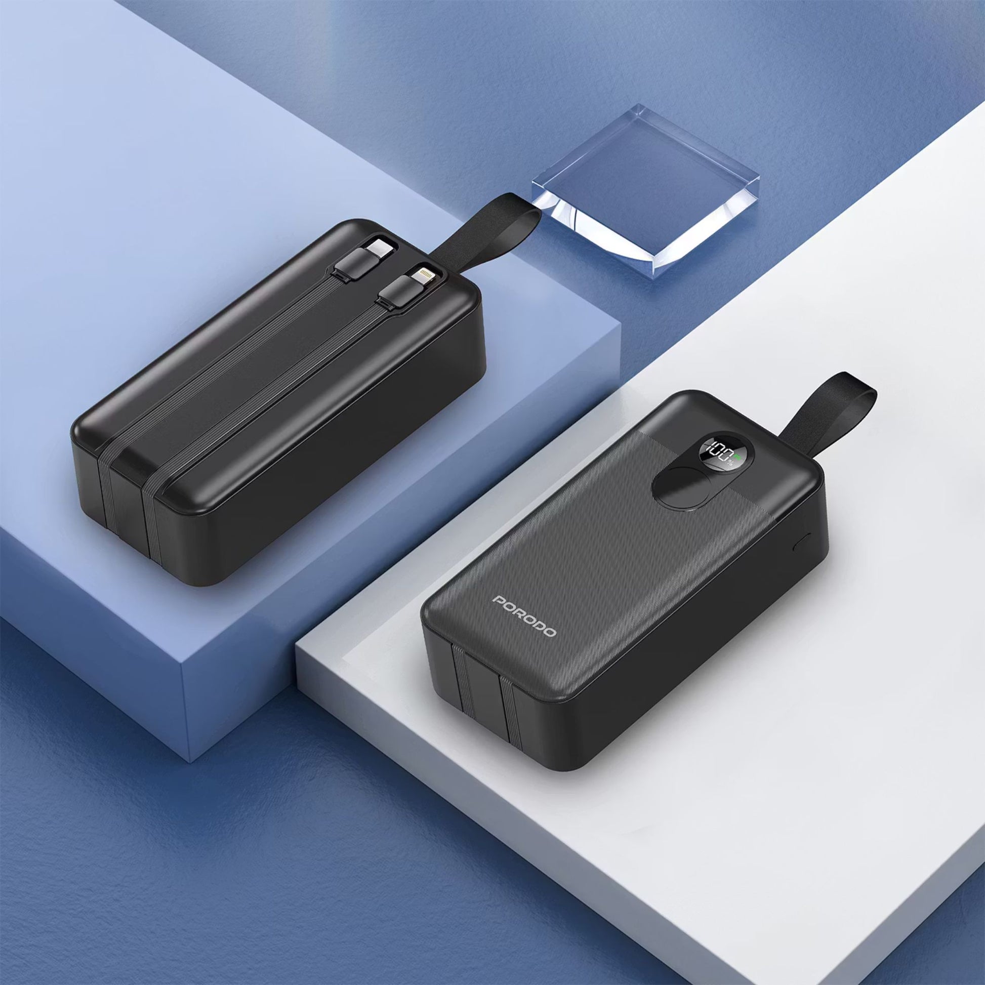 Porodo 50000mAh Power Bank with Built-in Type-C & Lightning Cables, 22.5W Power Delivery, Simultaneous Charging, 0%-60% Charge in 35 Minutes, Digital Display - Black