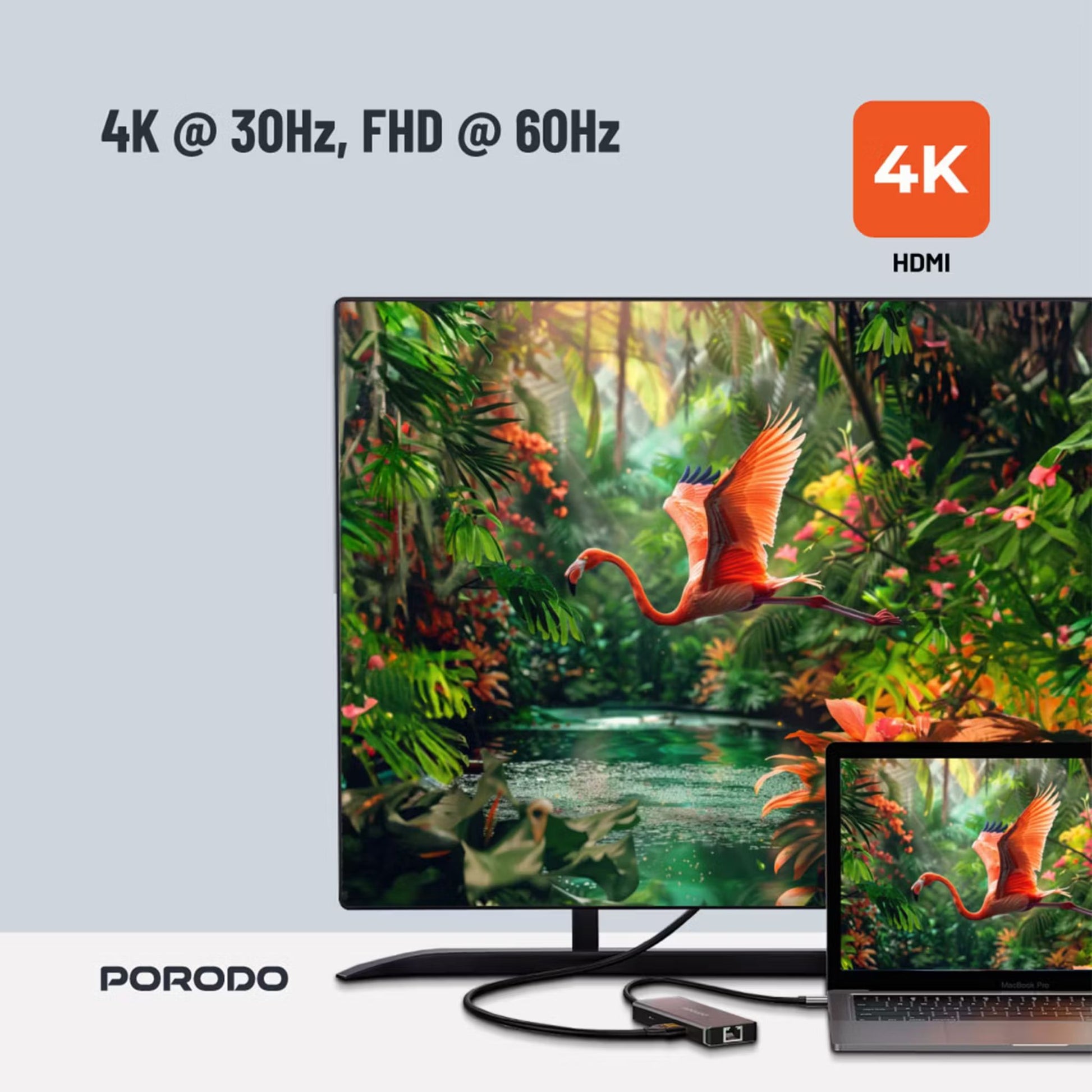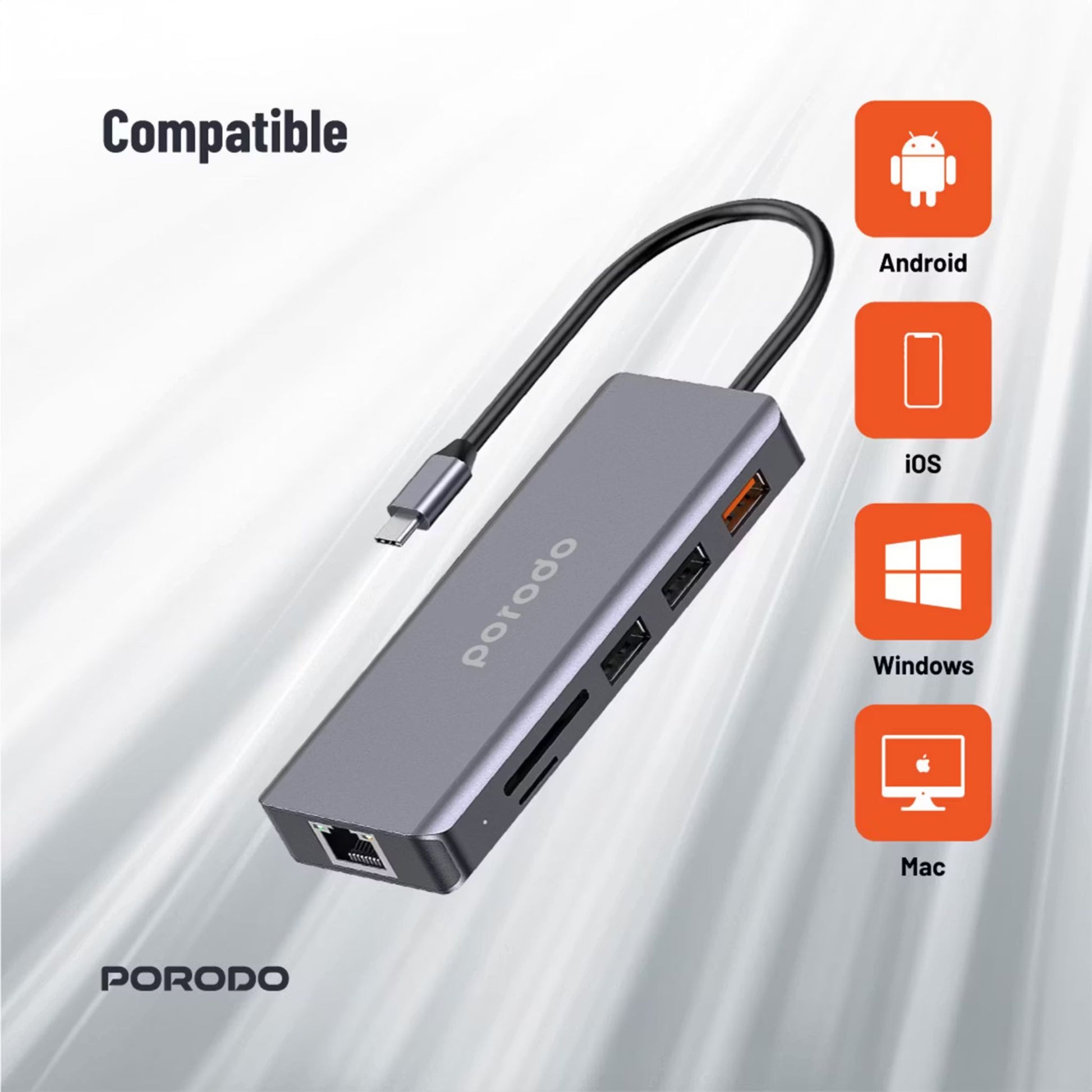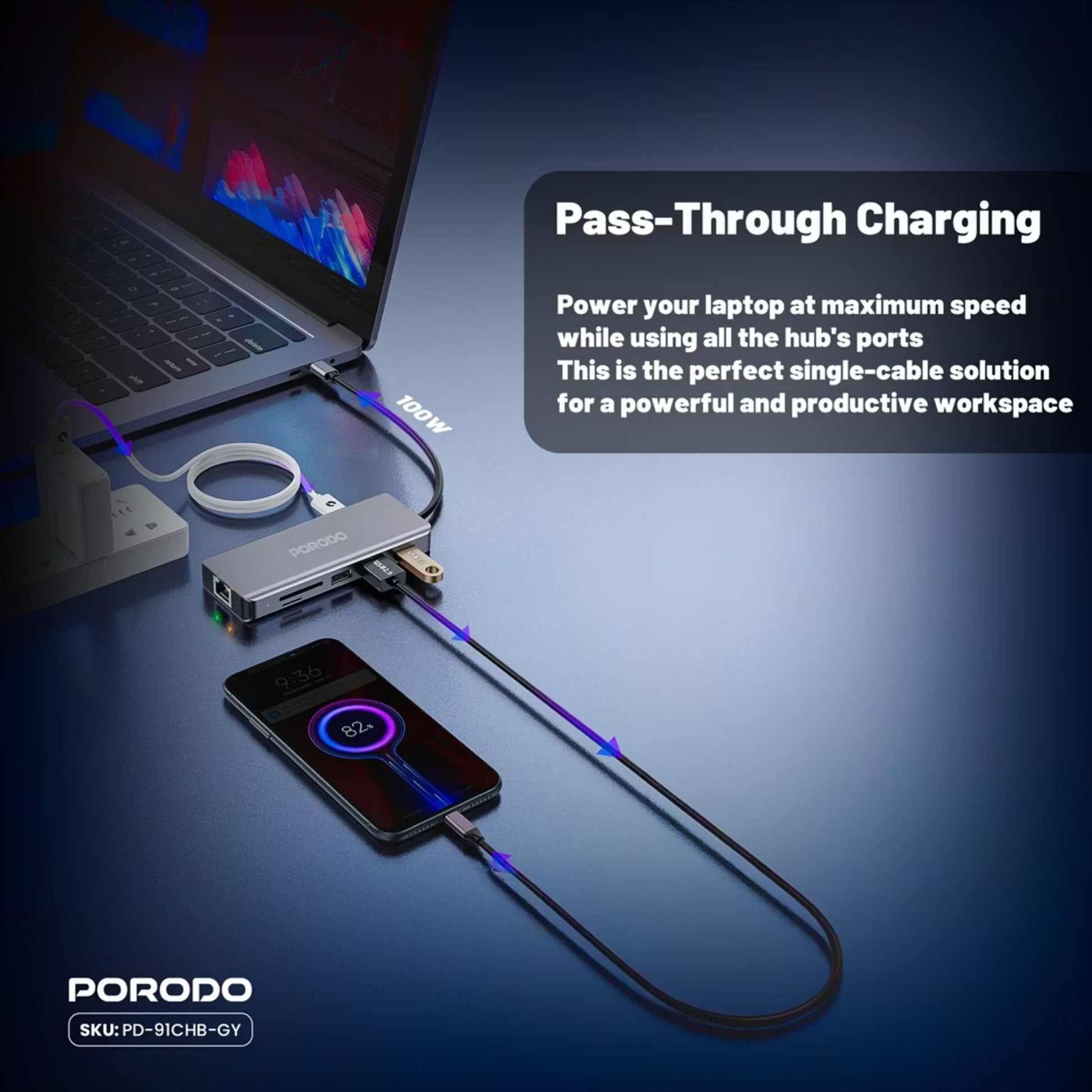Porodo 9-in-1 USB-C Hub 4K HDMI Ethernet with 100W Power Delivery, 3.5mm Aux, USB-C Version 3.2, 10Gbps Data Transfer Speed, SD & Micro SD Memory Slot - Gray