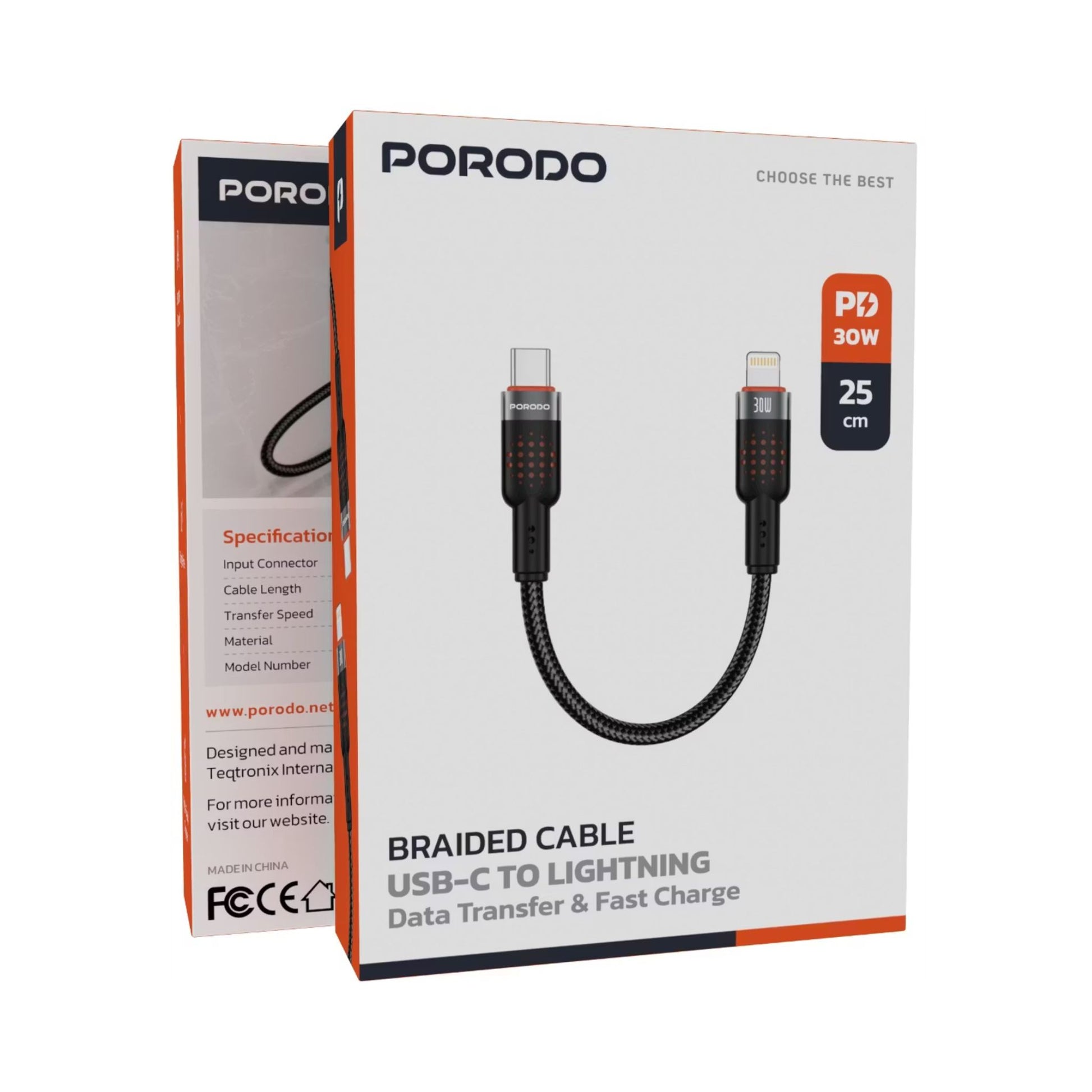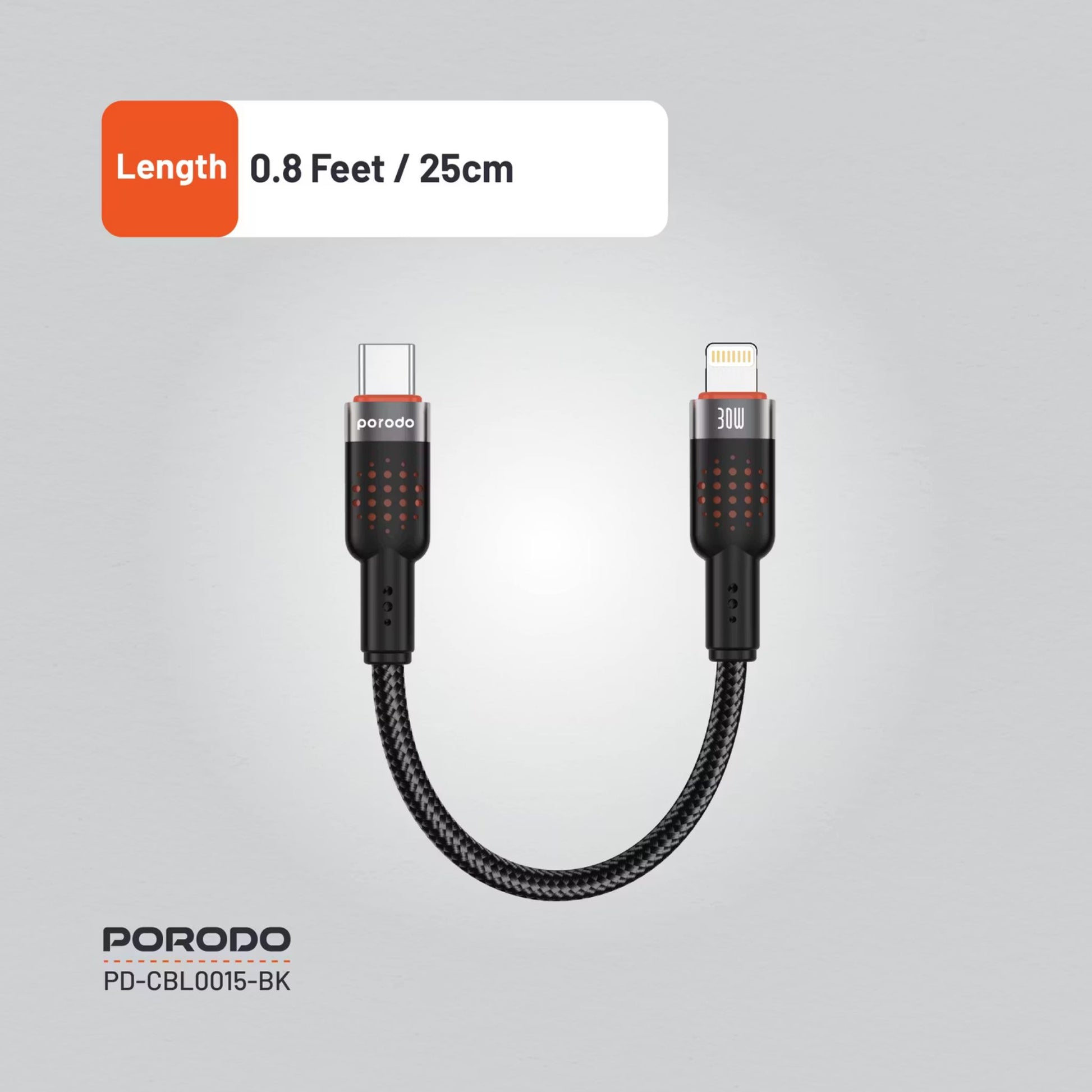 Porodo Aluminum Alloy Braided Cable Type-C to Lightning with 25cm Cable Length, PD 30W, 480Mbps Transfer Speed, more than 15000 Bends Life Span, Tangle Free - Black