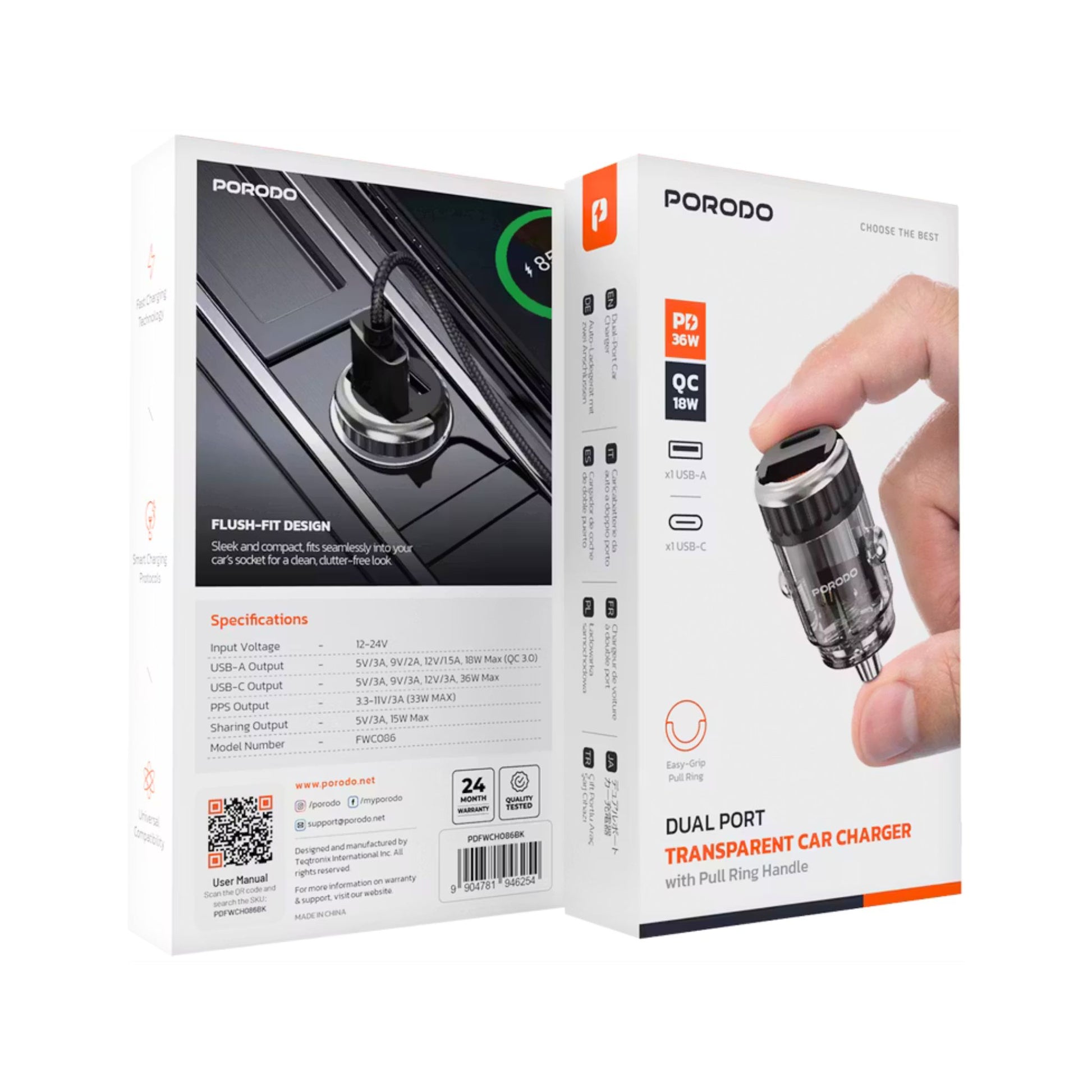 Porodo Dual Port Transparent Car Charger with PD 36W, QC 18W, USB-A & USB-C Ports, Pull Ring Handle, Fast Charging Technology, Smart Charging Protocols, Universal Compatibility - Black