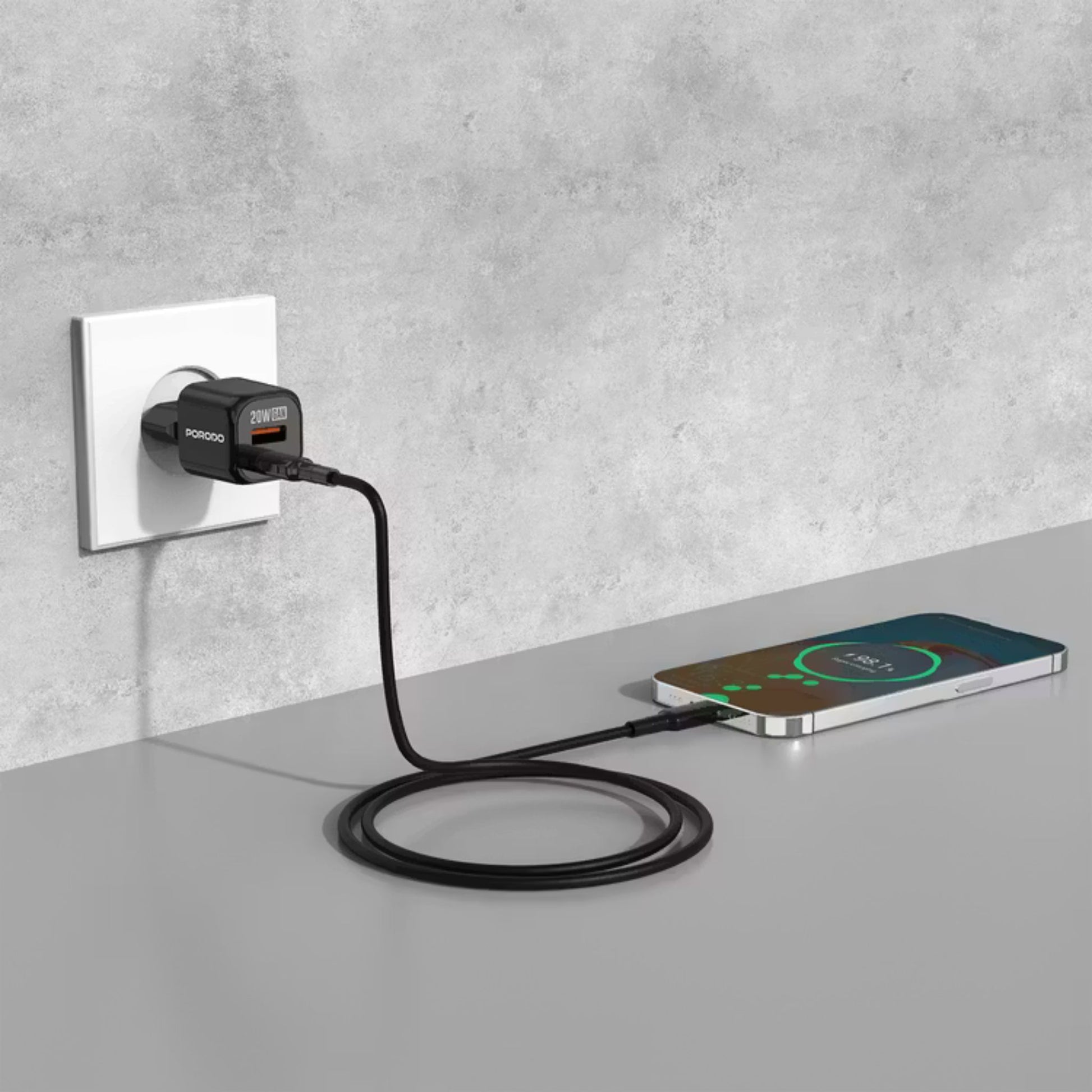 Porodo Dual-Port Wall Charger with Type-C to Lightning Included, 20W Power Delivery, EU Plug, QC 18W, Simultaneous Charging, Overheat Protection, USB-C & USB-A Outputs - Black