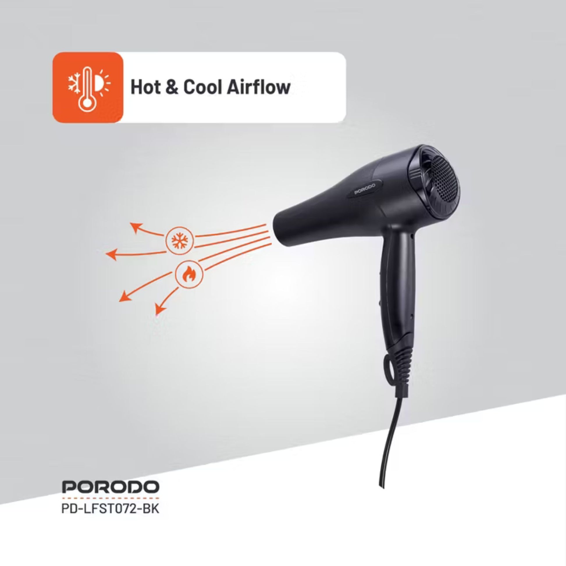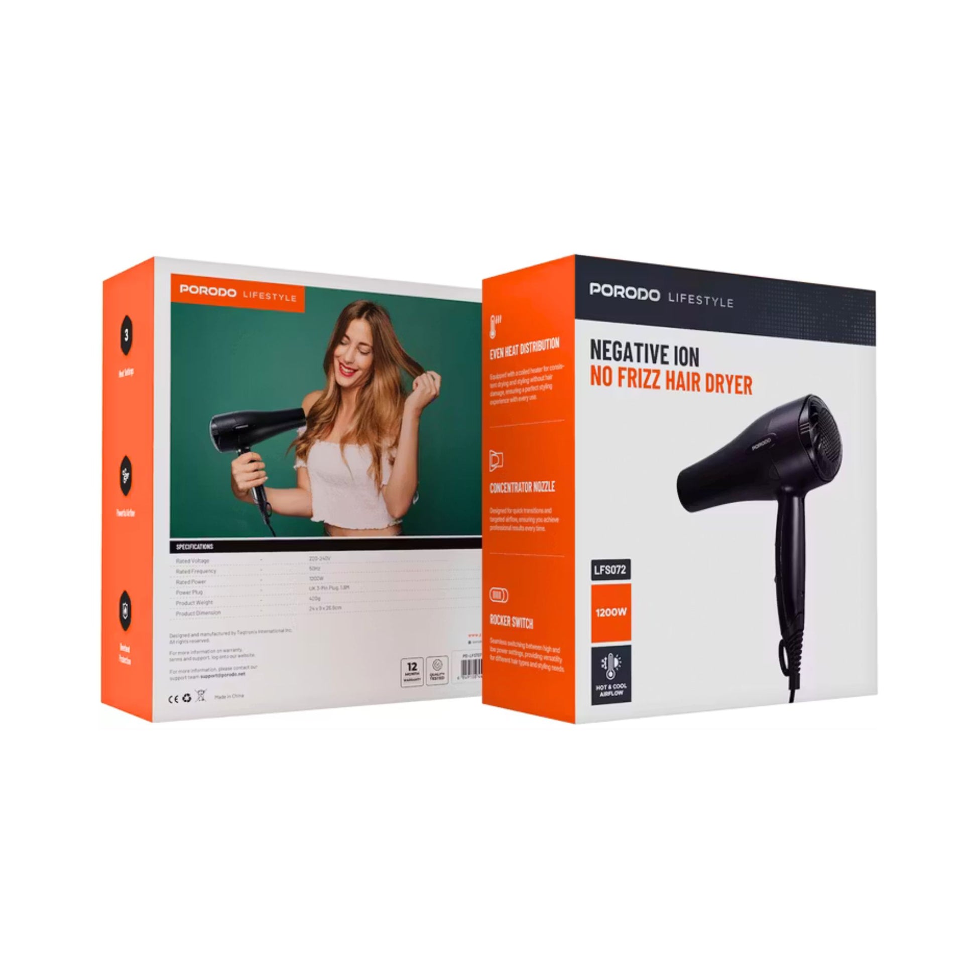 Porodo Lifestyle 1200W Hair Dryer with 1.8m Cable Length, Concentrator Nozzle, Rocker Switch, Overheat Protection, Powerful Airflow, UK 3-Pin Plug - Black