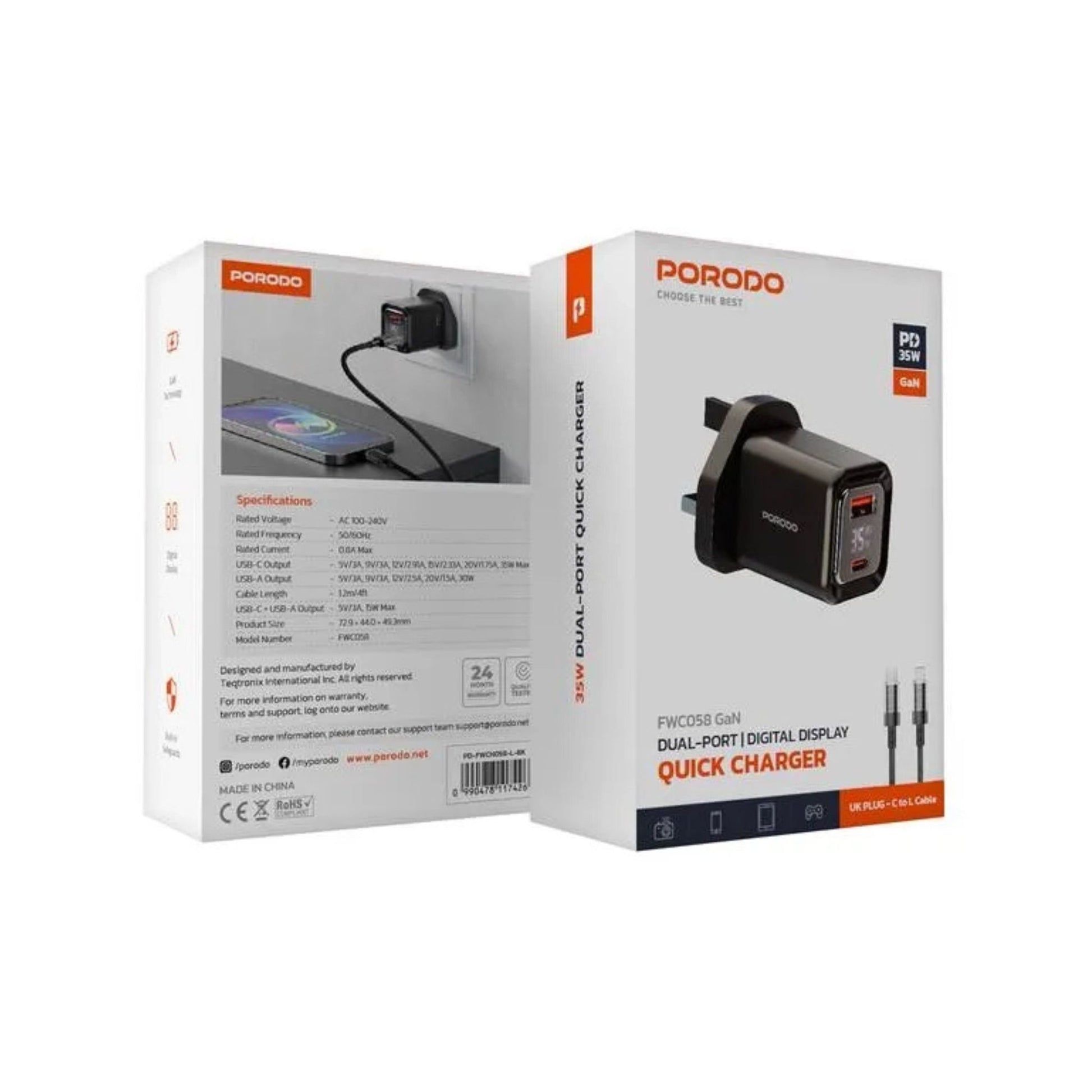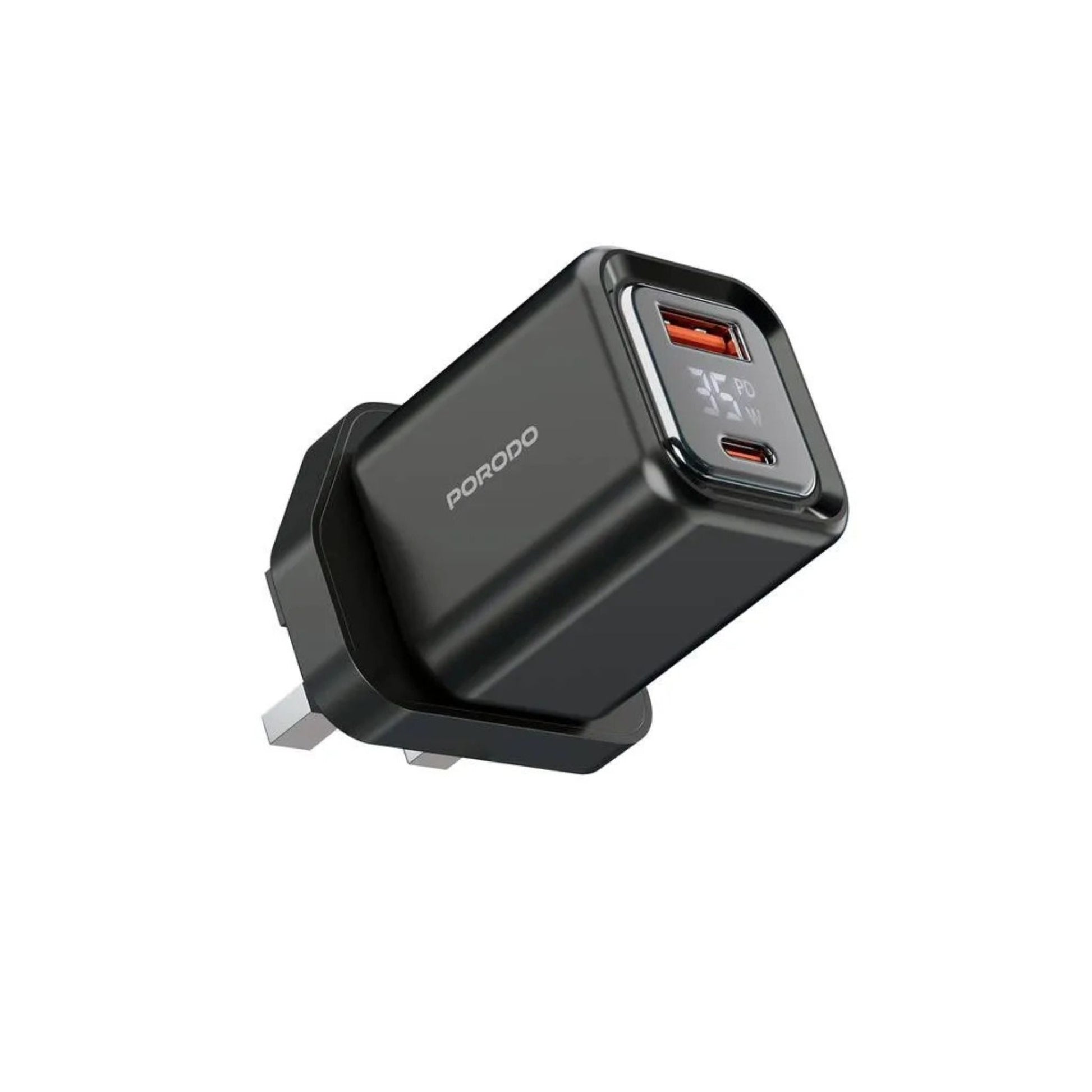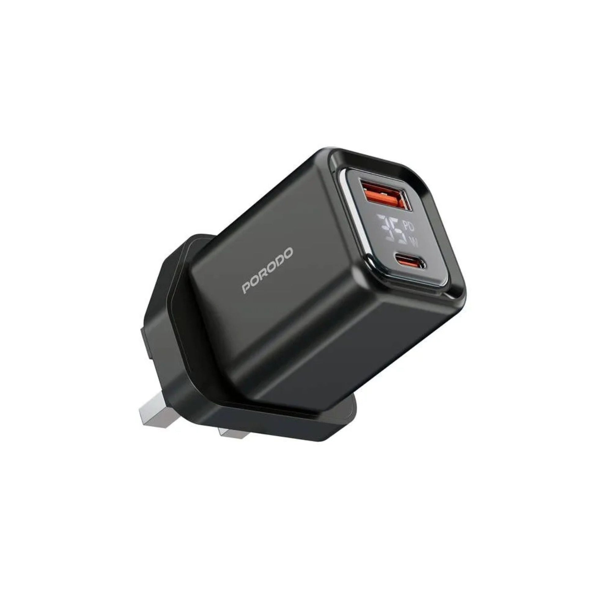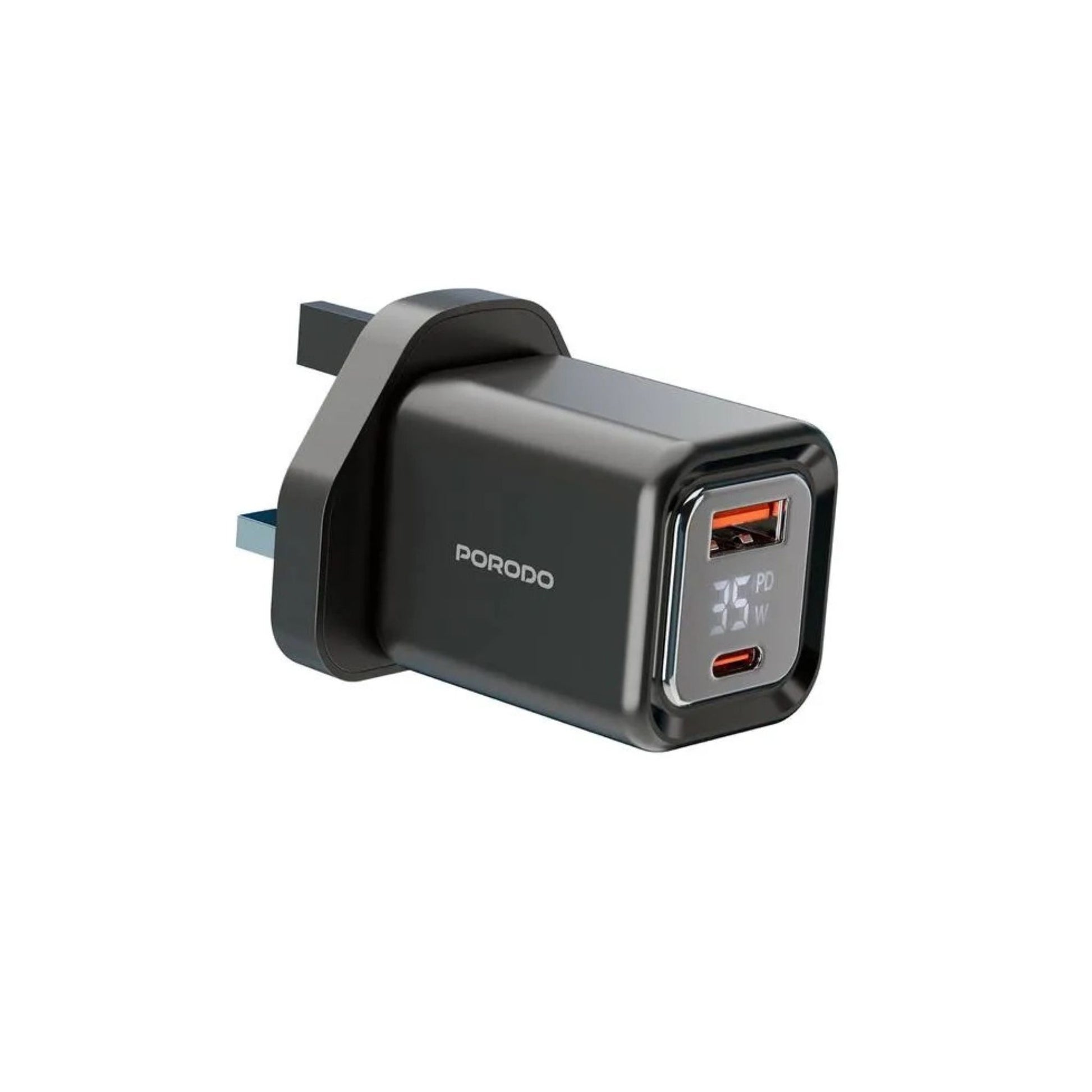 Porodo PD35W GaN Fast Charger with LCD Display, USB-C PD 35W Output, UK Plug, Includes Lightning Transparent Cable for iPhone & iPad, High-Speed Power Adapter – Black