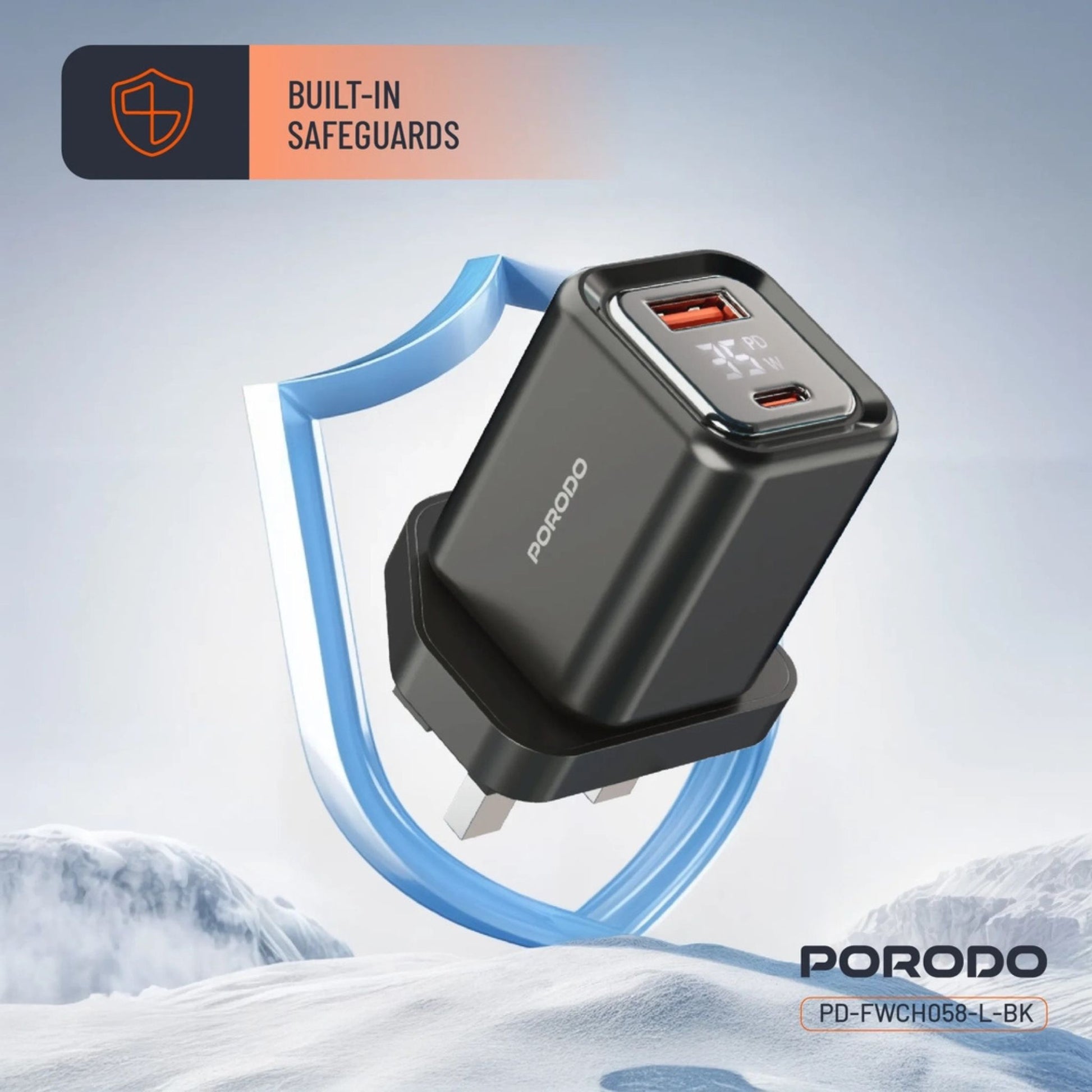 The Porodo Dual-Port Digital Display Quick Charger is capable of charging your devices quickly and efficiently through the use of safe GaN technology and delivers the power you need via AC 100-240V voltage. With USB-C and USB-A ports, along with all the options, you can charge your devices as needed. The USB-C outport supports the following fast charging modes: 5V/3A, 9V/3A, 12V/2.91A, 15V/2.33A, and 20V/1.75A for up to 35W power usage. The USB-A outport supports 5V/3A, 9V/3A, 12V/2.5A, and 20V/1.5A for up to 30W fast charging. The Porodo Quick Charger supports PD 35W charging with a 1.2m cable, allowing you to charge your devices from a distance. The digital display shows you the charging status of your device, while you can be assured the built-in safeguards will protect your devices from overcharging, overheating, and short-circuiting. The Porodo Dual-Port Digital Display Quick Charger is perfect for quick and reliable charging.