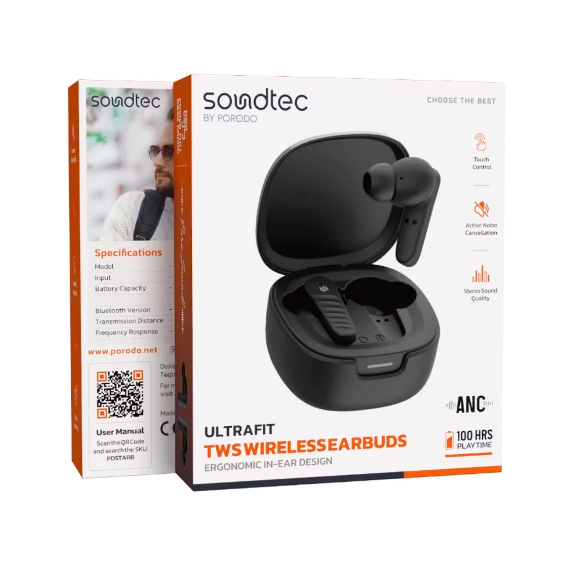 Porodo Ultrafit TWS Earbuds offer an ergonomic in-ear design, active noise cancellation, Bluetooth 5.4, and a 10m range. Get up to 100 hours playtime with a 250mAh case and 40mAh earbuds. Touch control-Black