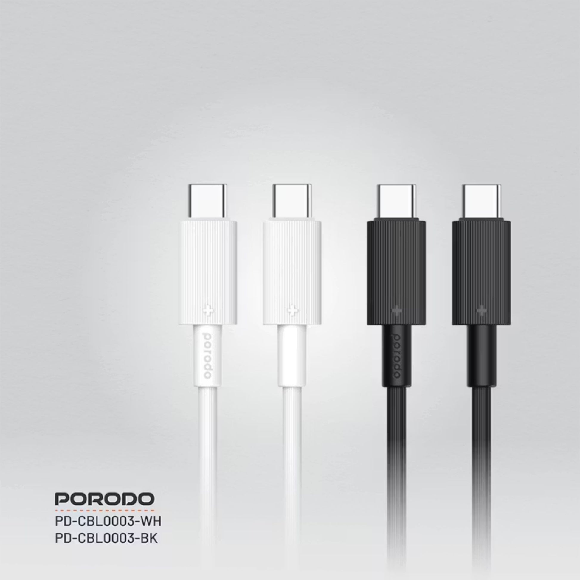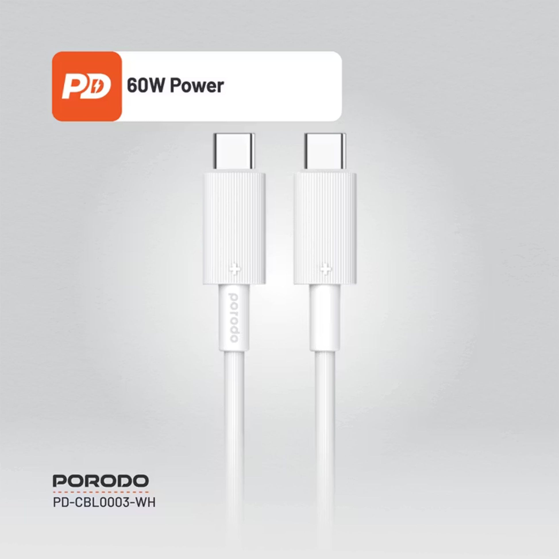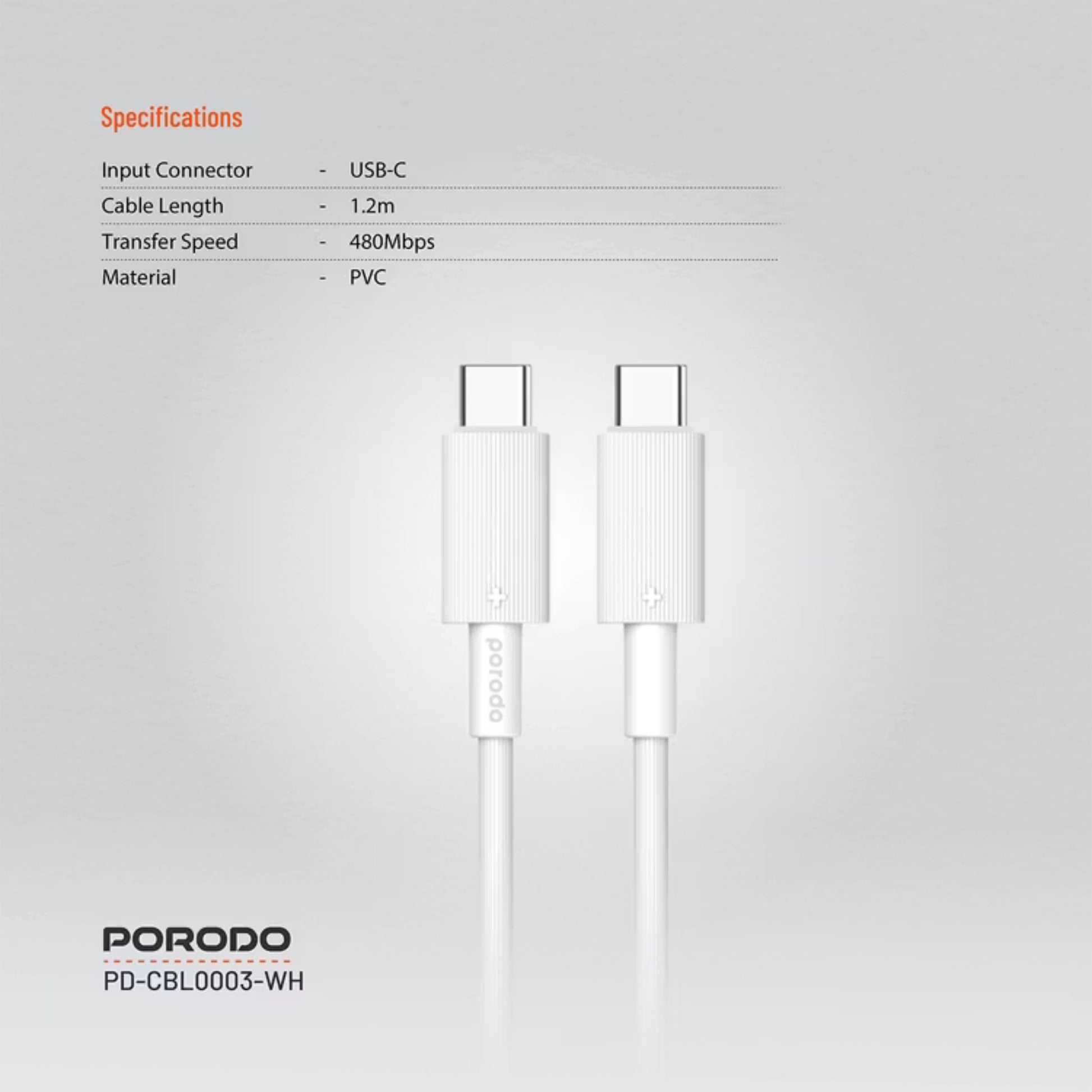 Porodo USB-C to USB-C PVC Cable, 480Mbps Transfer Speed, 60W Power Delivery, more than 15000 Bends Life Span, 1.2m Cable Length, Tangle Free - White