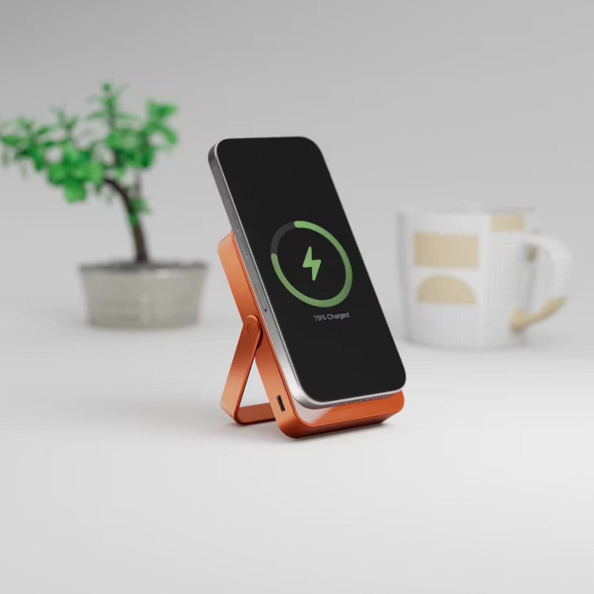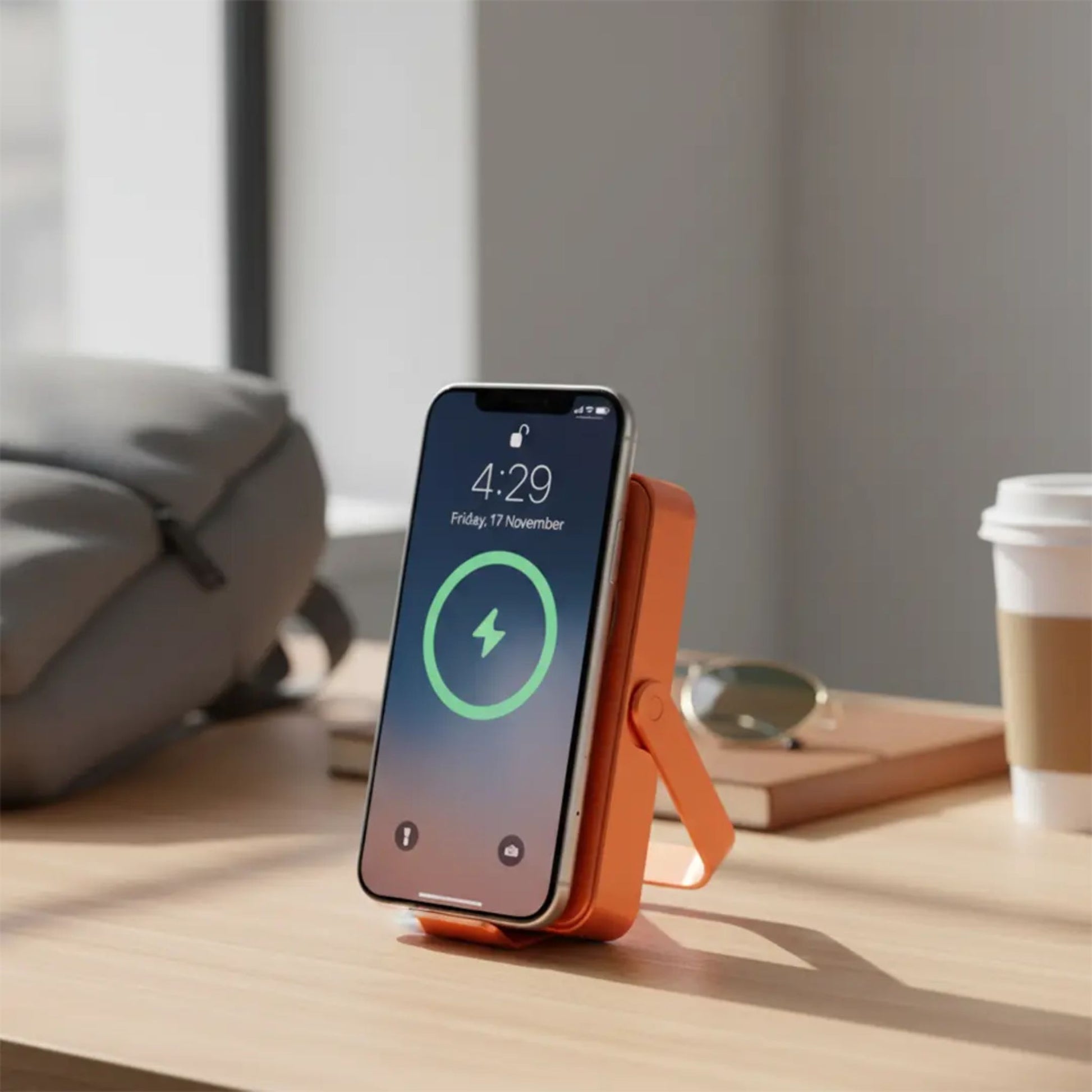 Powerology 10000mAh Magsafe Glass Surface Power Bank with Compact Design, Type-C & Wireless output, Integrated Stand, Aluminum Material, 20W Power Delivery, Cable-Free - Orange