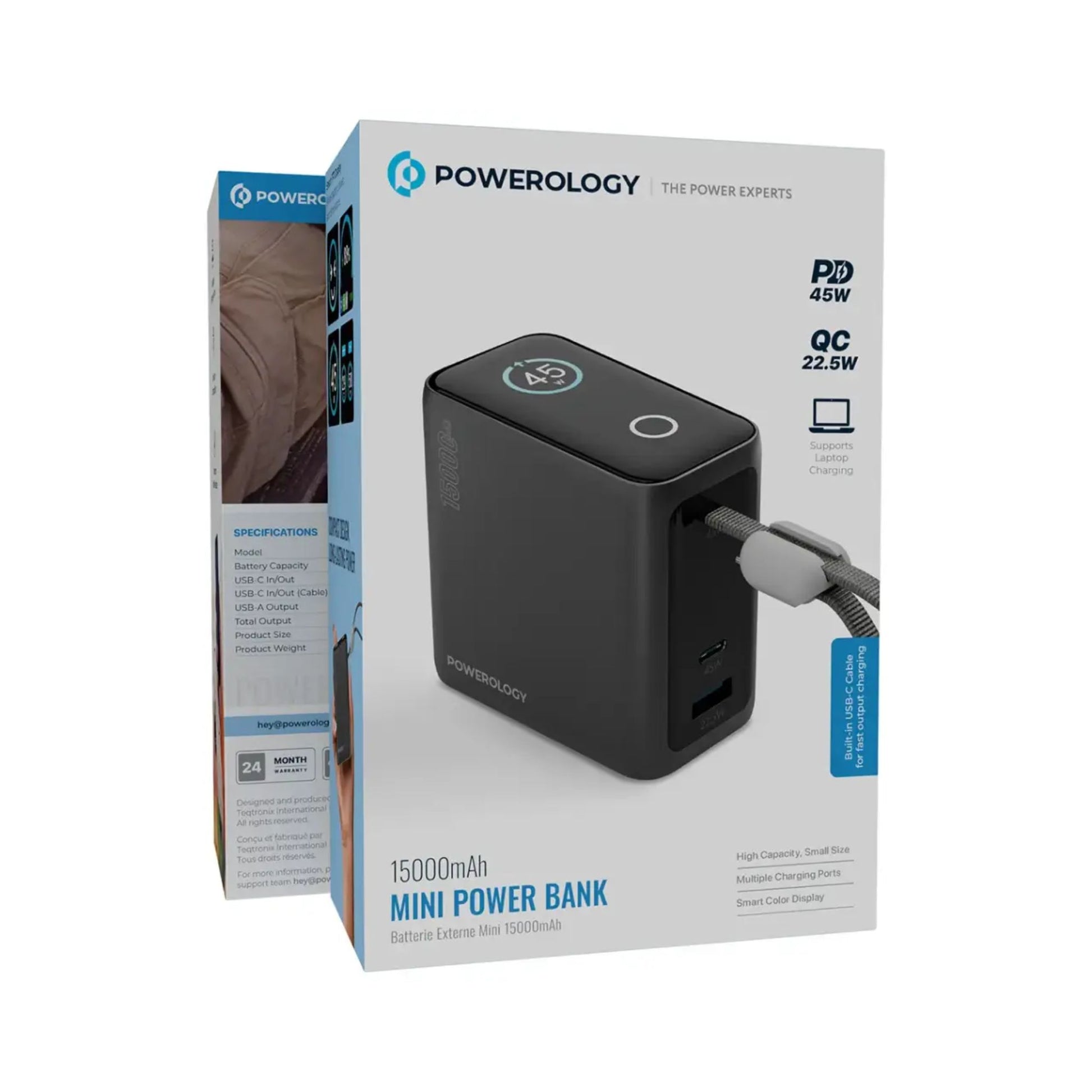 Powerology 15000mAh Mini Power Bank with Multiple Charging Ports, Universal Compatibility, Advanced Safety Features, Smart TFT Display, Built-in USB-C Cable - Black