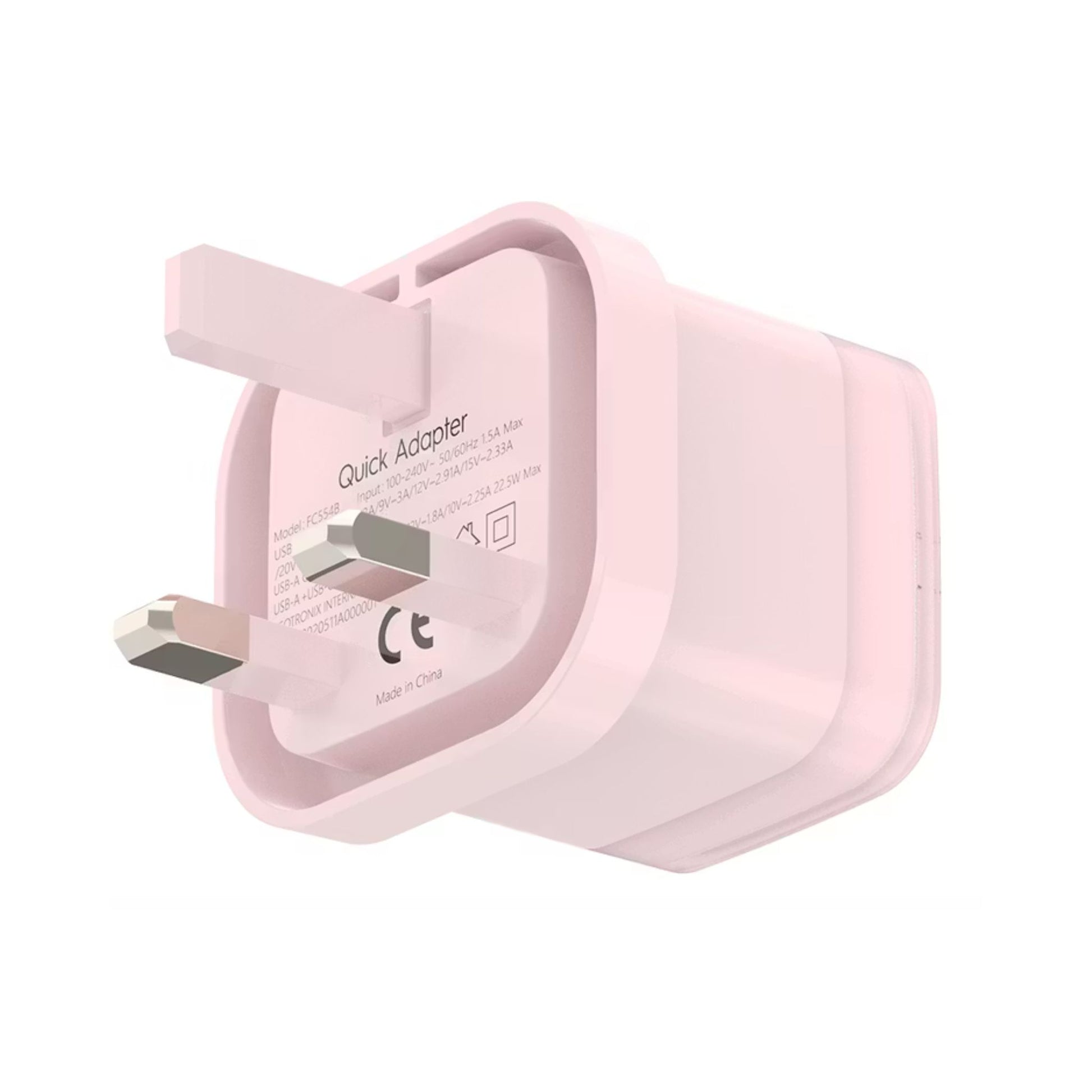 Powerology Lunex Dual-Port Fast Charging Adapter with USB-C & USB-A Ports, 35W Power Delivery, 22.5W USB-A Output, UK 3-Pin Plug, Universal Protocol Support, Multi-Device Charging - Pink