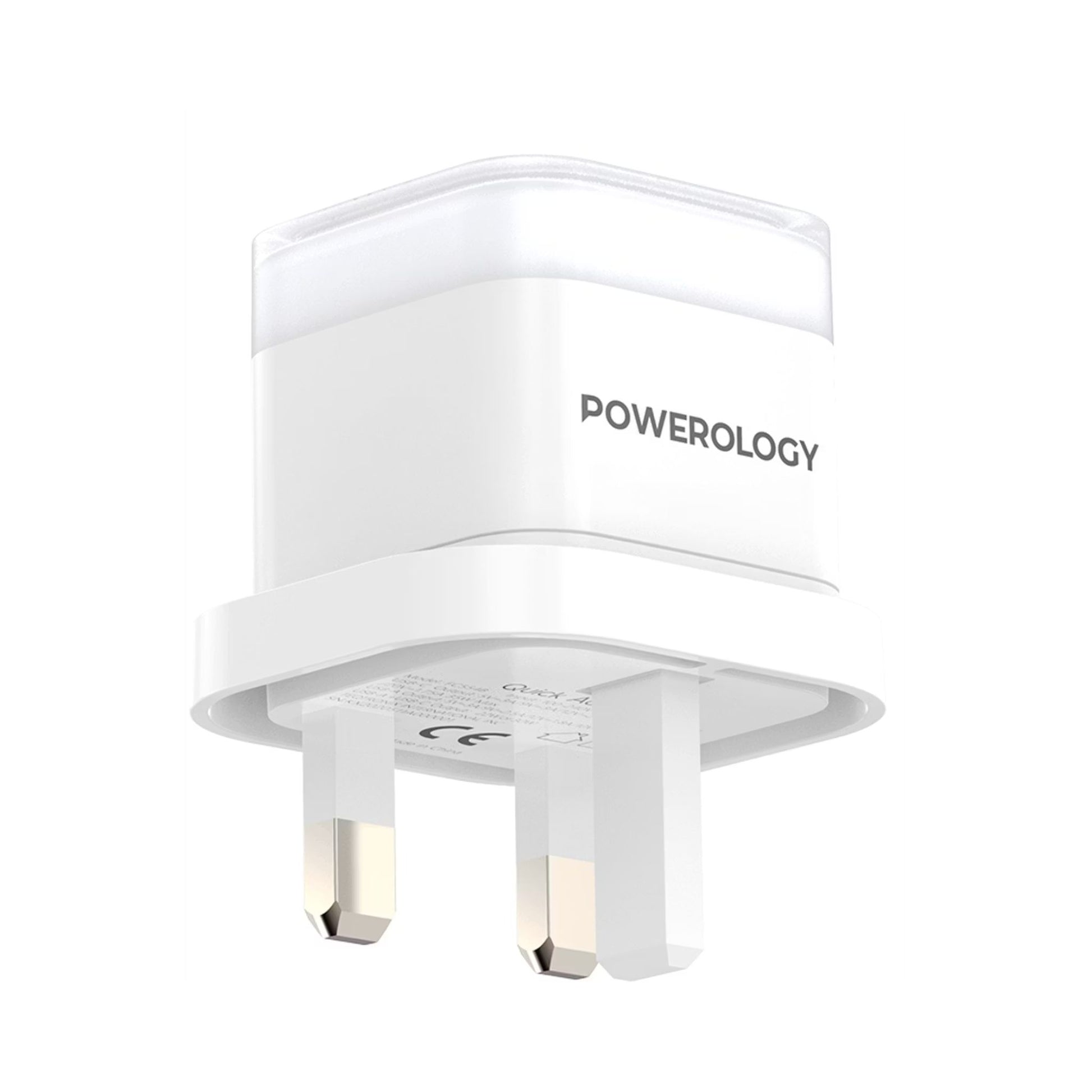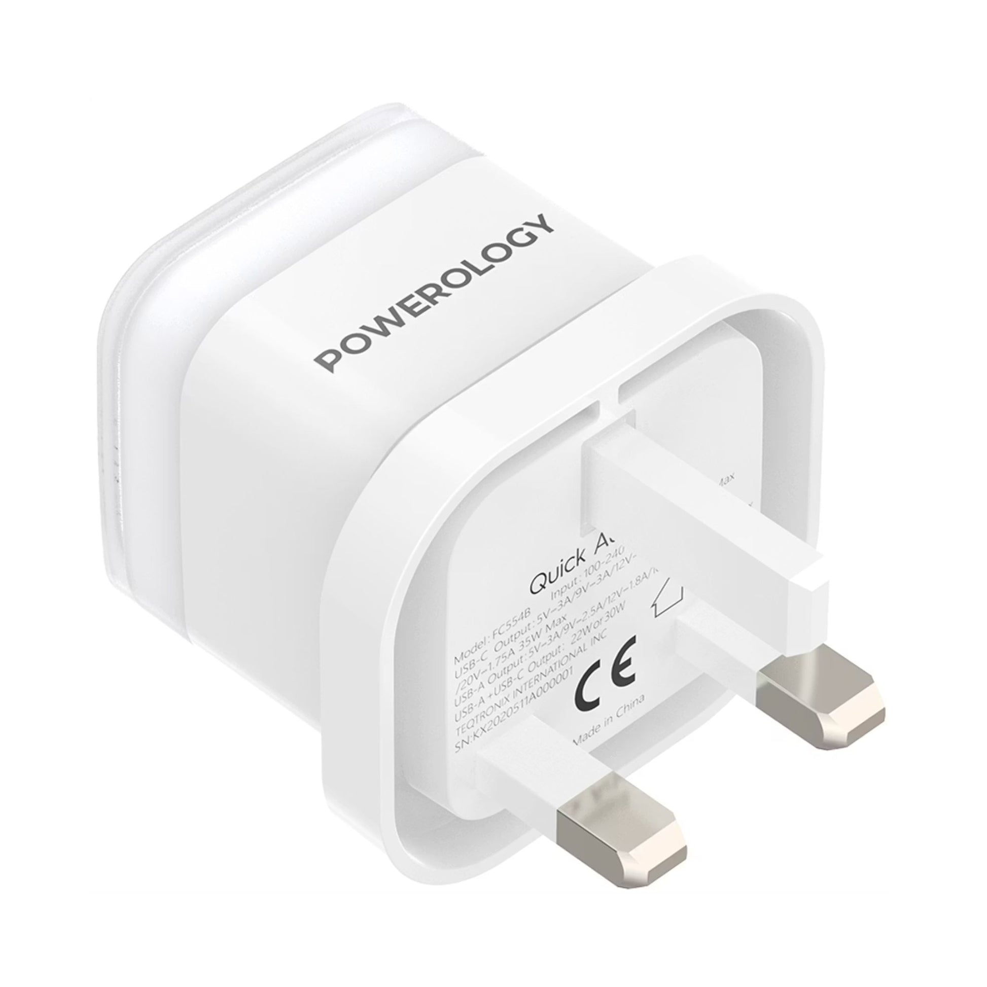 Powerology Lunex Dual-Port Fast Charging Adapter with USB-C & USB-A Ports, 35W Power Delivery, 22.5W USB-A Output, UK 3-Pin Plug, Universal Protocol Support, Multi-Device Charging - White