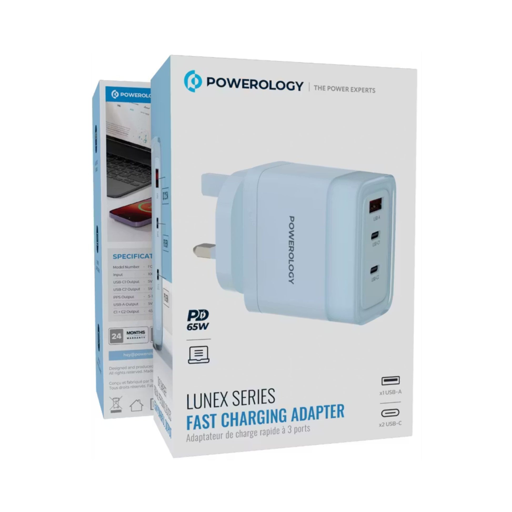 Powerology Lunex Series 3-Port Fast Charging Adapter with UK 3-Pin Power Plug, 65W PD USB-C Output, 22.5W QC USB-A Output, Multi-Device Charging, Powerful Laptop Charging, Universal Protocol Support - Blue
