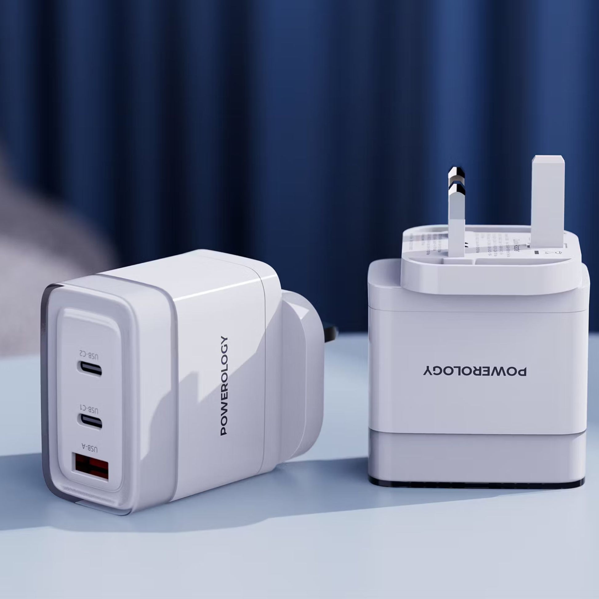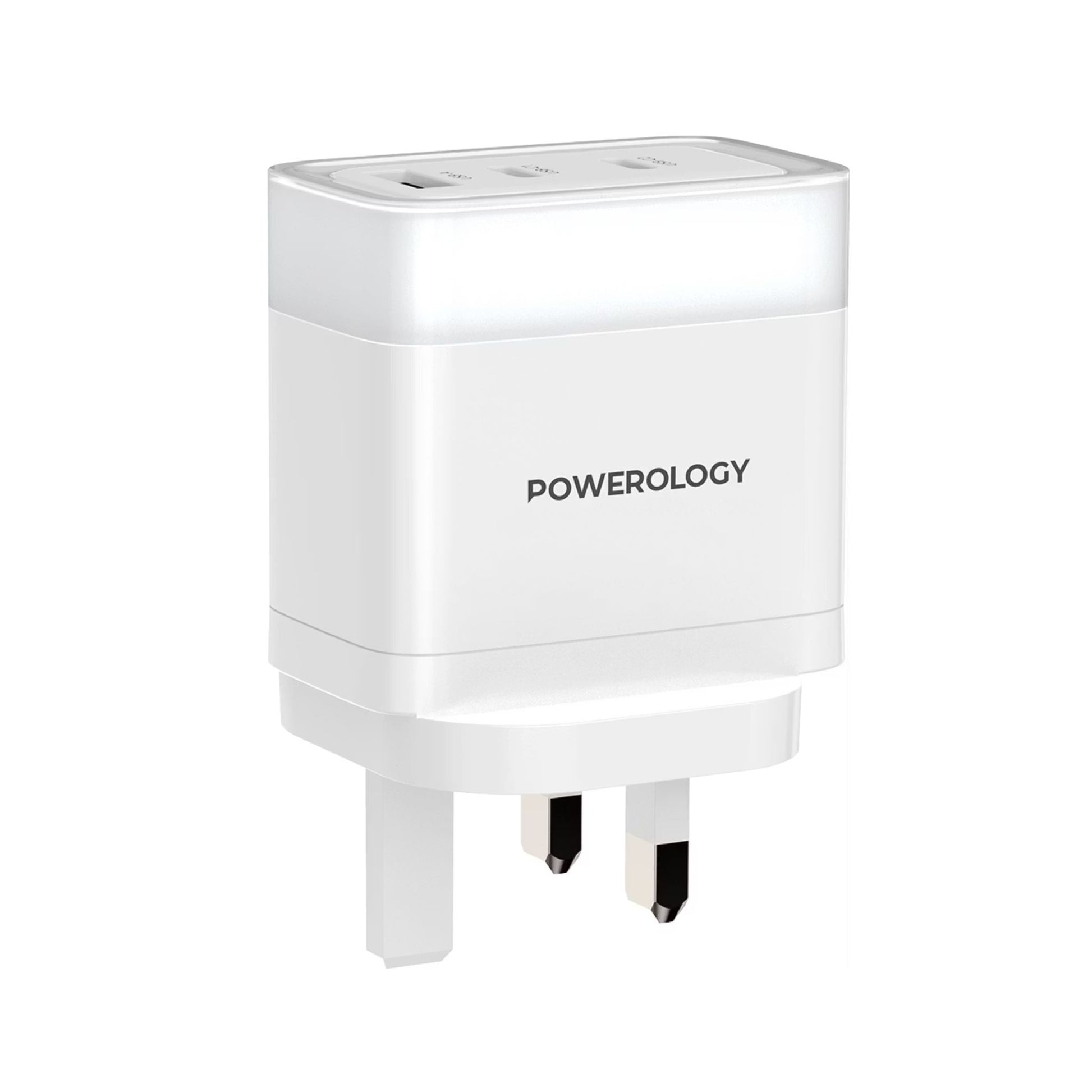 Powerology Lunex Series 3-Port Fast Charging Adapter with UK 3-Pin Power Plug, 65W PD USB-C Output, 22.5W QC USB-A Output, Multi-Device Charging, Powerful Laptop Charging, Universal Protocol Support - White