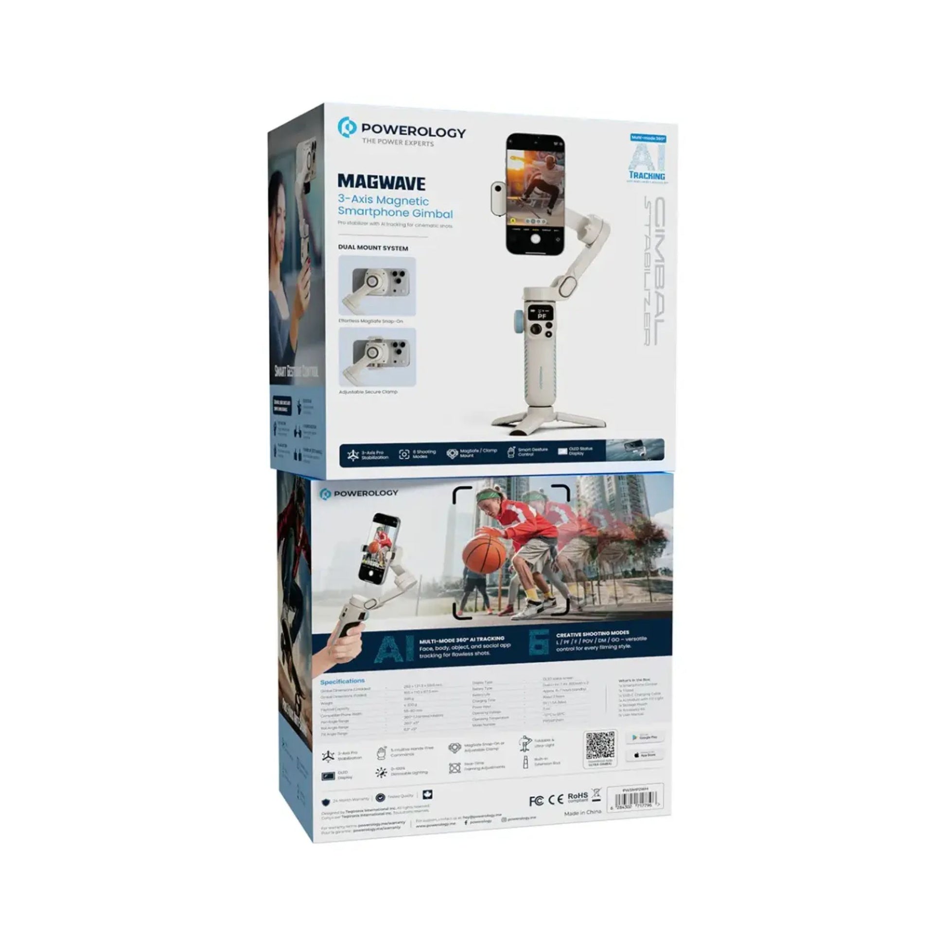 Powerology Magwave 3-Axis Magnetic SmartPhone Gimbal with Smart Gesture Control, MagSafe Snap-On or Adjustable Clamp, Built-in Extension Rod, Foldable & Ultra-Light Design, OLED Display, 5 Intuitive Hands-Free Commands, 6 Shooting Modes - White