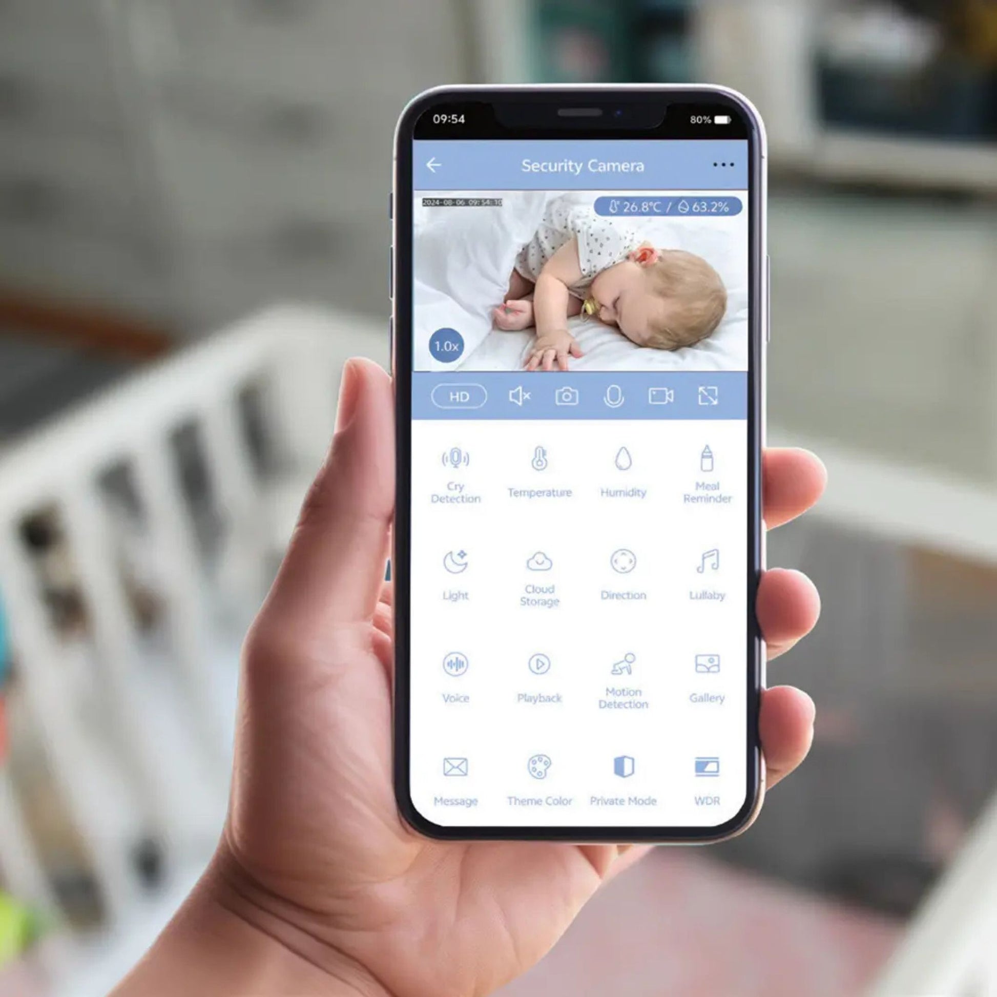 Powerology Monitor & App Baby Camera provides reassurance through enhanced monitoring capabilities. It has a 5-inch HD display and 1080p Full HD resolution, showing crystal-clear real-time video of your baby. Connect with ease using 2.4GHz WiFi and remotely control the camera using a user-friendly app for both Android and iOS. Equipped with smart infrared and color night vision, the camera provides clear video even in low light. The two-way intercom allows you to hear and speak to your baby from anywhere. With AI motion tracking and cry detection, the system instantly alerts your phone for added security. Other features include pan, tilt, and zoom functions, temperature notifications for when the room is too cold or too hot, and eight soothing built-in lullabies. Micro SD storage supported up to 256GB (not included). Power-saving with Type-C charging, this baby monitor provides constant, reliable monitoring for your child.
