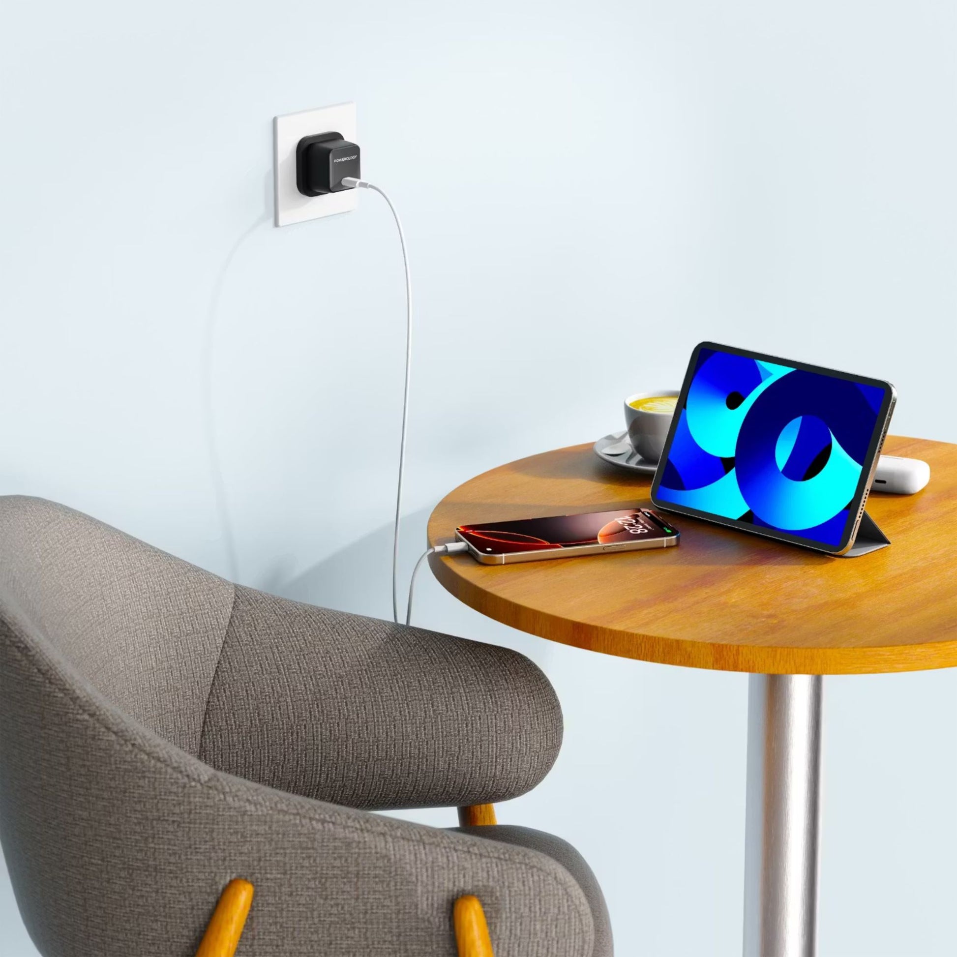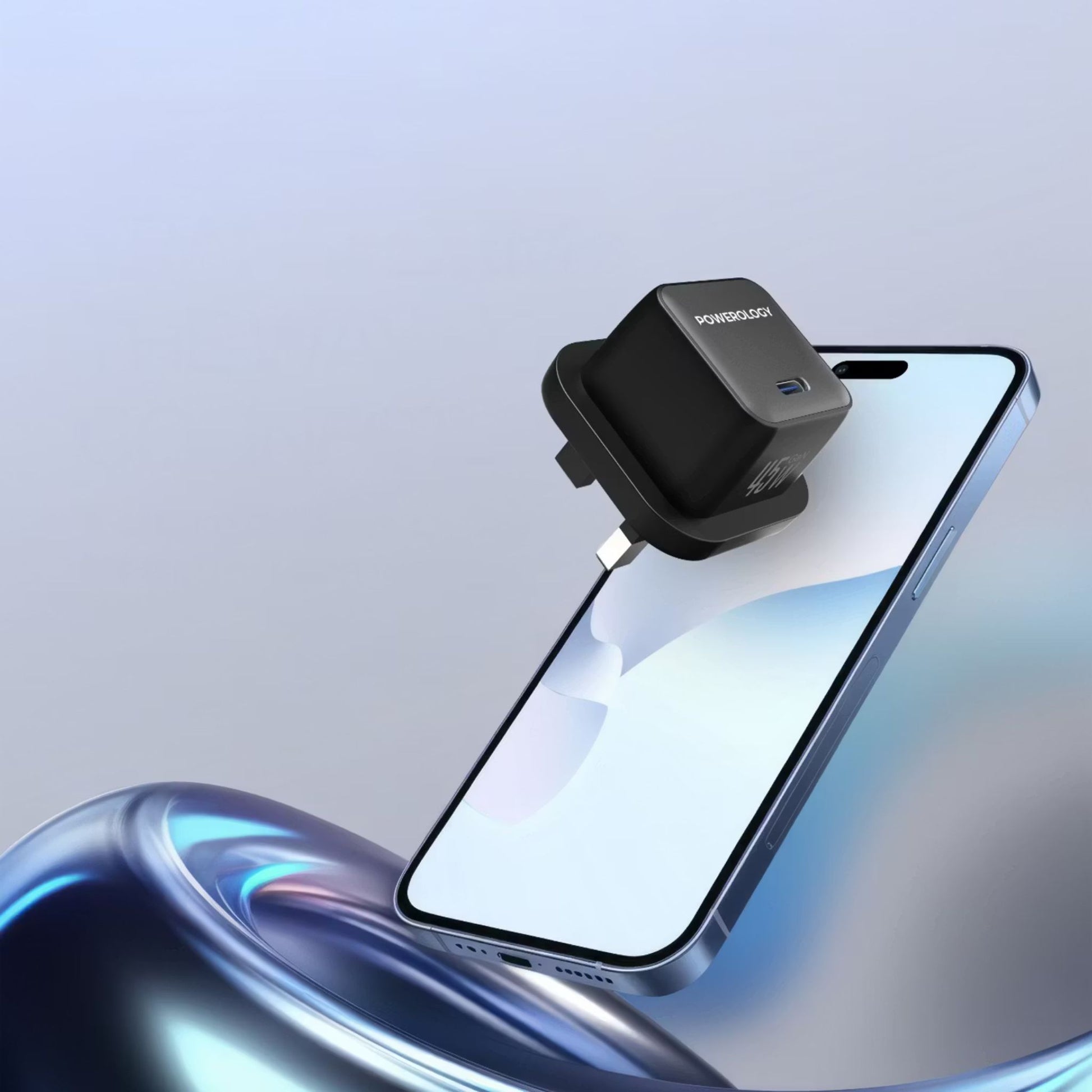 Powerology QX 45W Pocket-Sized GaN Adapter with Safety Protections, USB-C Port, Ultra-Compact Design, UK 3-Pin Plug, PD 45W - Black / Gray