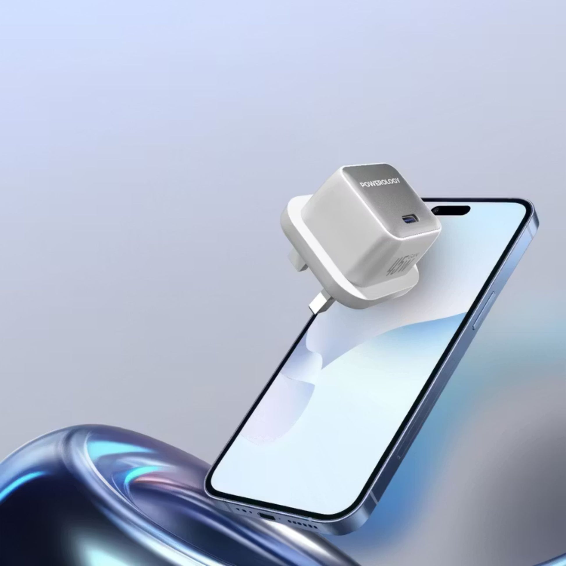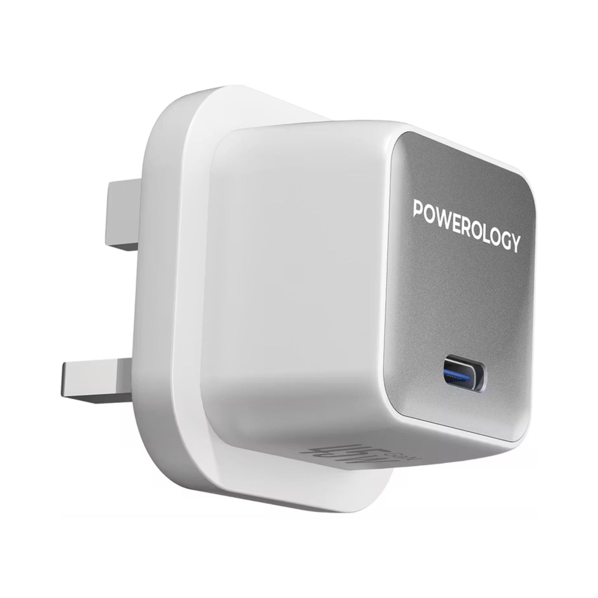 Powerology QX 45W Pocket-Sized GaN Adapter with Safety Protections, USB-C Port, Ultra-Compact Design, UK 3-Pin Plug, PD 45W - White / Silver