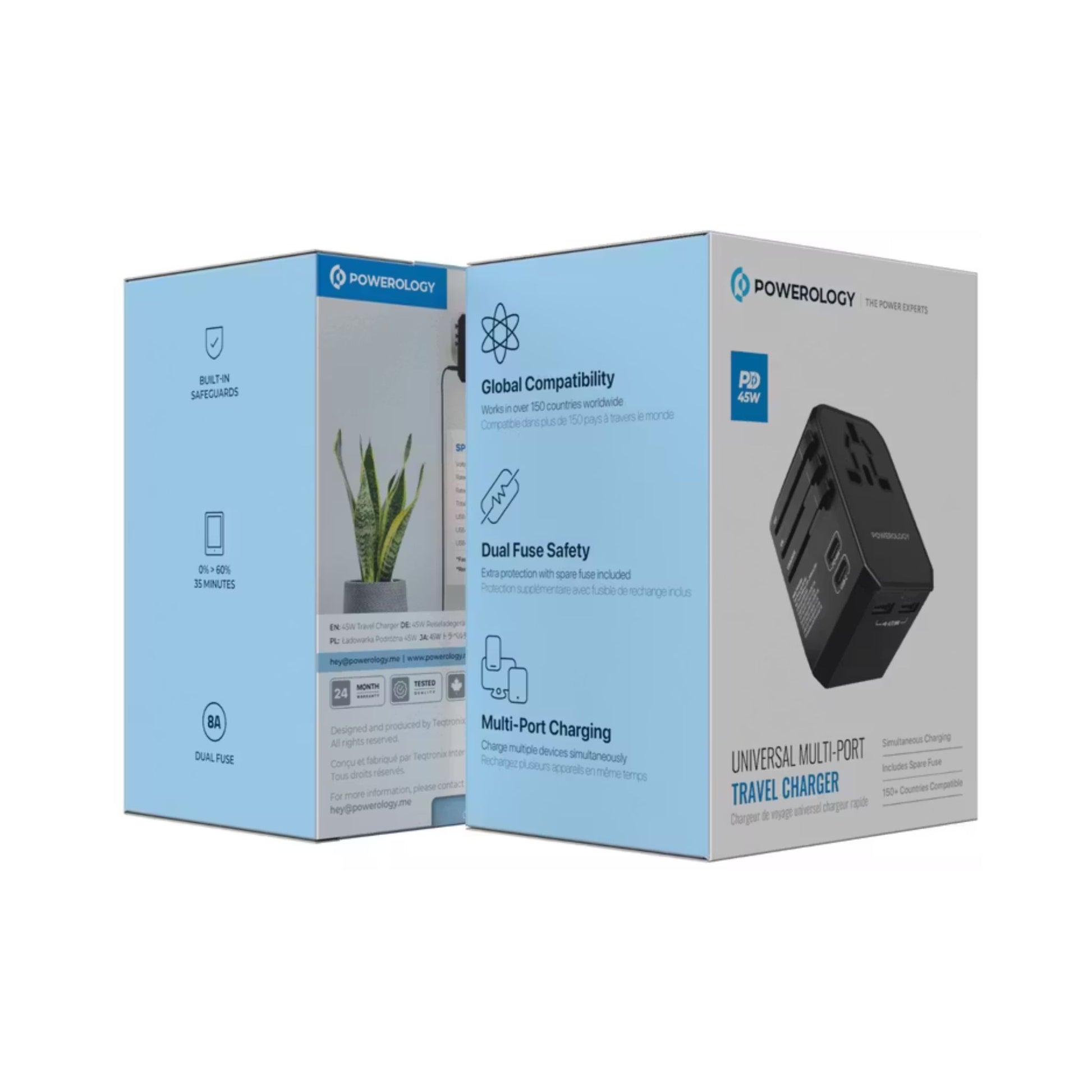 Powerology Universal Multi-Port Travel Charger with 45W Power Delivery, 8A Dual Fuse, Simultaneous Charging, Built-in Safeguards, Fast Charging, Active Protect - Black