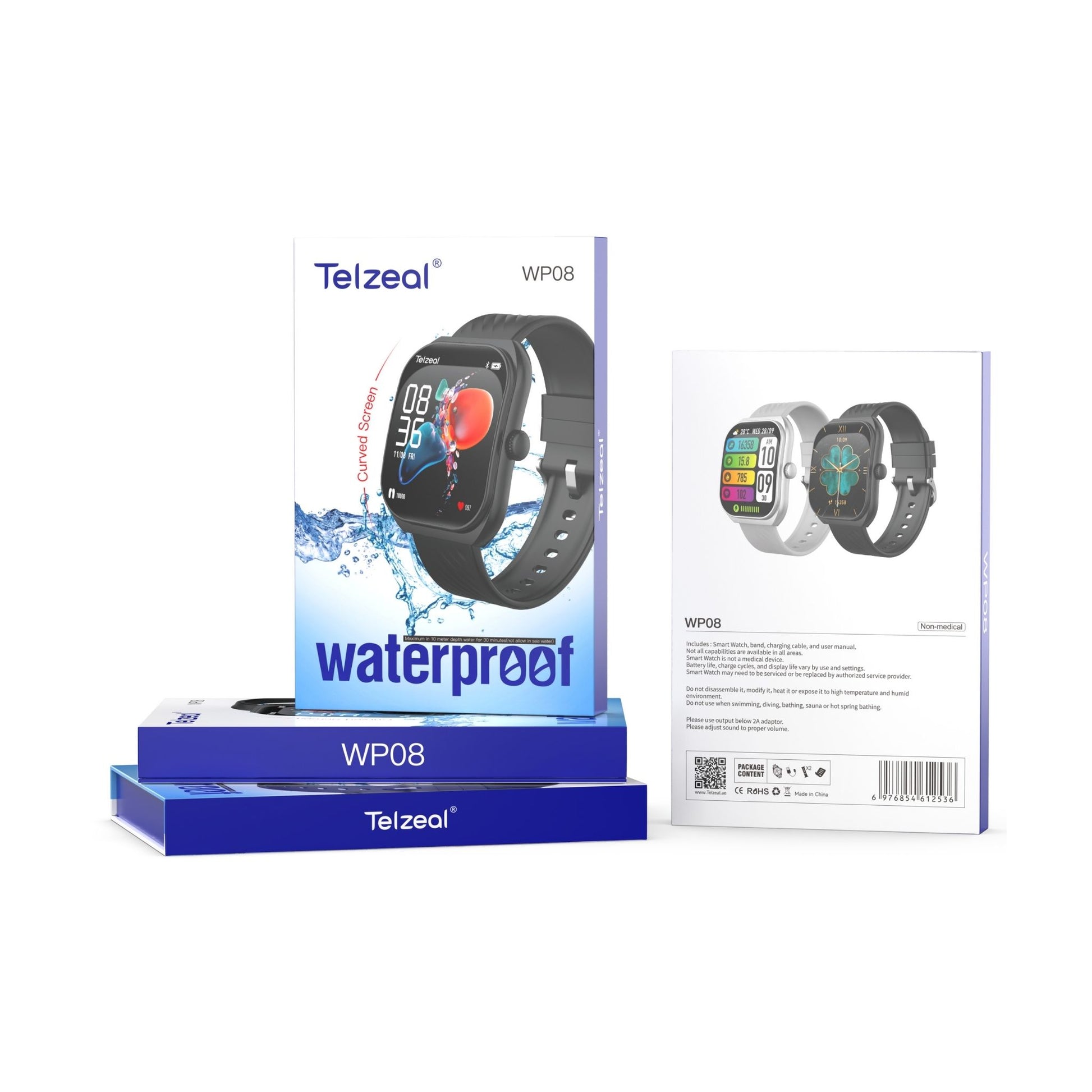 The Telzeal WP08 smartwatch is designed with a waterproof construction that can easily handle daily exposure to sweat, rain, and splashes, making it suitable for workouts and outdoor activities. Depending on the IP rating (often IP68), it can also support swimming, offering reliable performance in various environments while maintaining long-term durability. -